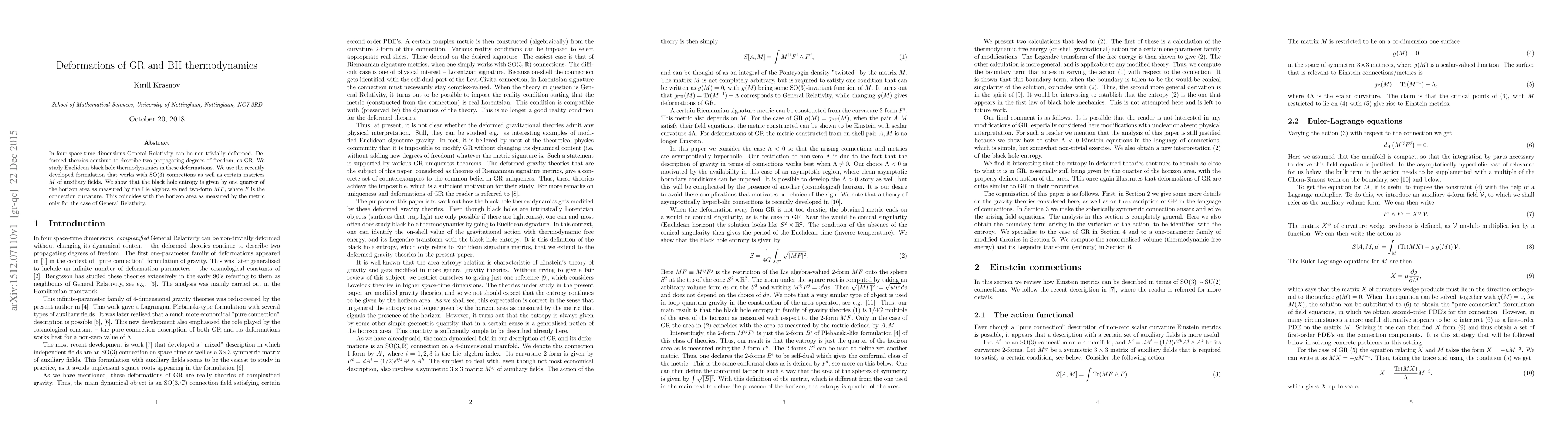 In four space-time dimensions General Relativity can be non-trivially deformed. Deformed theories continue to describe two propagating degrees of freedom, as GR. We study Euclidean black hole thermodynamics in these deformations. We use the recently developed formulation that works with SO(3) connections as well as certain matrices M of auxiliary fields. We show that the black hole entropy is given by one quarter of the horizon area as measured by the Lie algebra valued two-form MF, where F is the connection curvature. This coincides with the horizon area as measured by the metric only for the case of General Relativity.