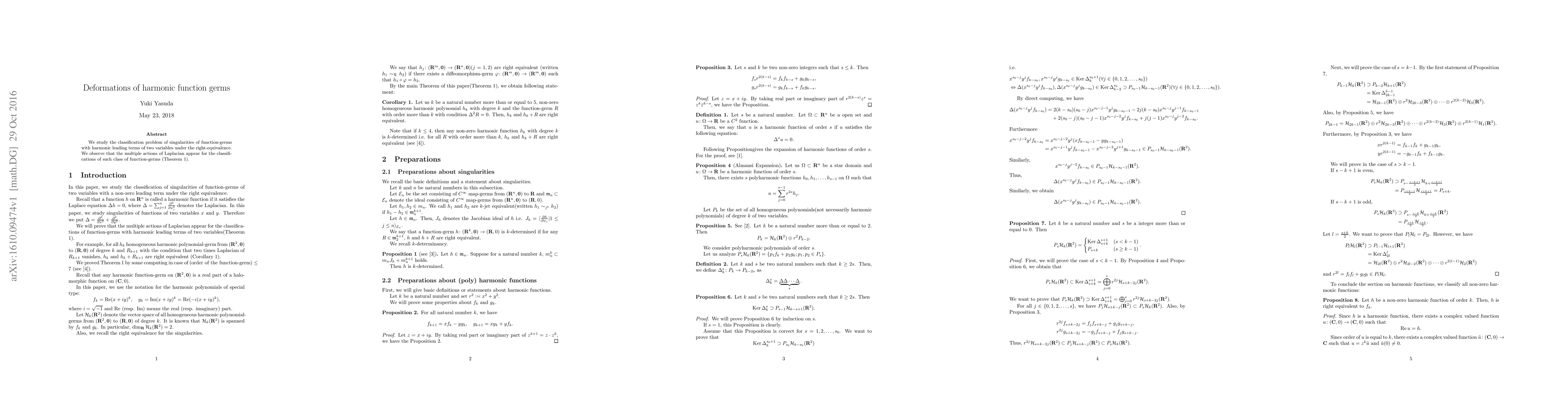 This paper classifies singularities of harmonic function germs in two variables under right-equivalence, noting the role of multiple Laplacian actions in the classification process.