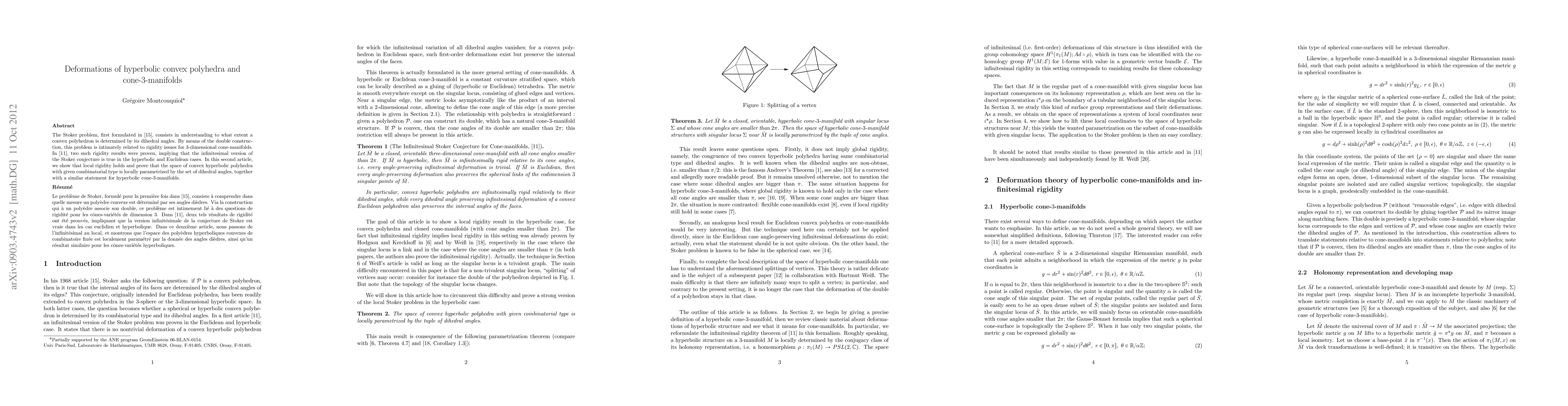 The Stoker problem, first formulated in 1968, consists in understanding to what extent a convex polyhedron is determined by its dihedral angles. By means of the double construction, this problem is intimately related to rigidity issues for 3-dimensional cone-manifolds. In a former paper, two such rigidity results were proven, implying that the infinitesimal version of the Stoker conjecture is true in the hyperbolic and Euclidean cases. In this second article, we prove that local rigidity holds and obtain that the space of convex hyperbolic polyhedra with given combinatorial type is locally parameterized by the set of dihedral angles, together with a similar statement for hyperbolic 3-cone-manifolds.