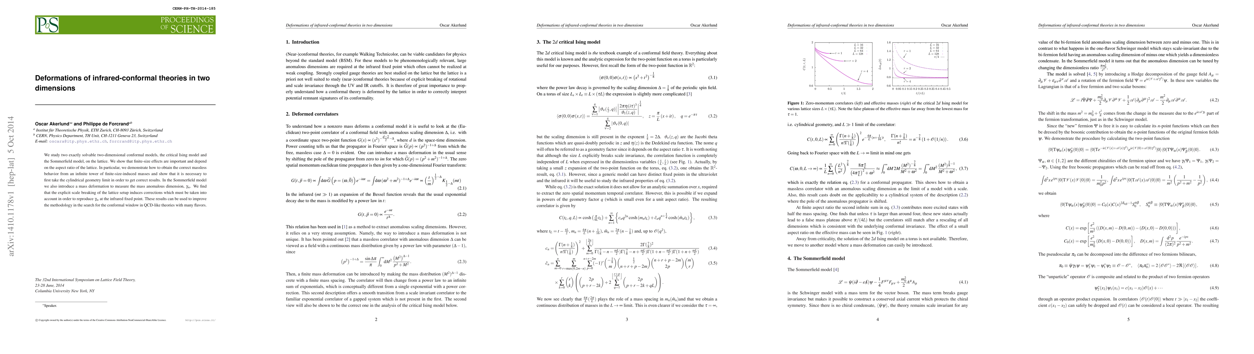 We study two exactly solvable two-dimensional conformal models, the critical Ising model and the Sommerfield model, on the lattice. We show that finite-size effects are important and depend on the aspect ratio of the lattice. In particular, we demonstrate how to obtain the correct massless behavior from an infinite tower of finite-size-induced masses and show that it is necessary to first take the cylindrical geometry limit in order to get correct results. In the Sommerfield model we also introduce a mass deformation to measure the mass anomalous dimension, $\gamma_m$. We find that the explicit scale breaking of the lattice setup induces corrections which must be taken into account in order to reproduce $\gamma_m$ at the infrared fixed point. These results can be used to improve the methodology in the search for the conformal window in QCD-like theories with many flavors.
