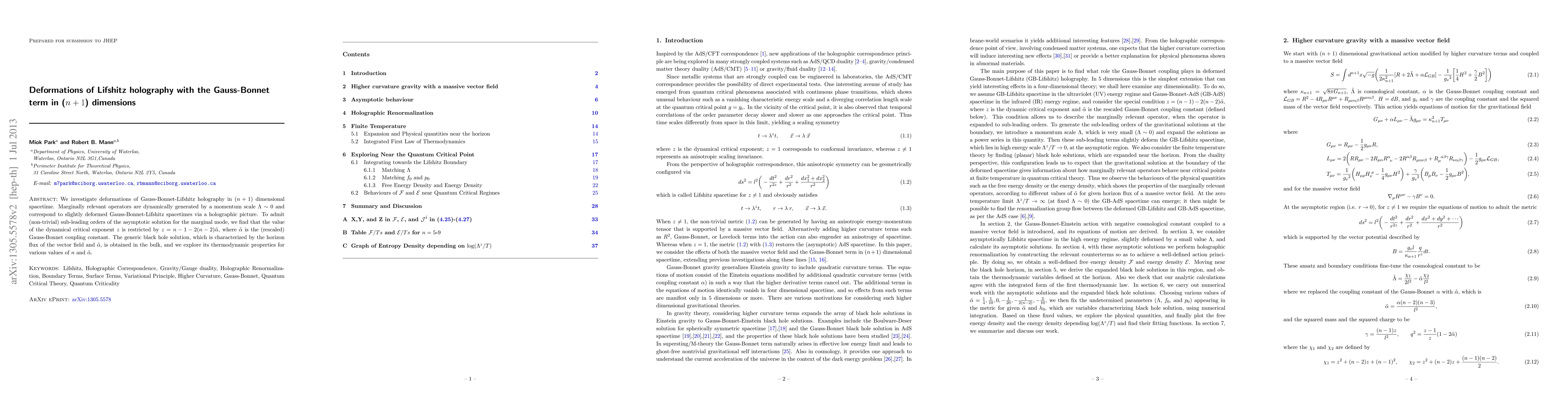This paper explores the deformations of Gauss-Bonnet-Lifshitz holography in $(n+1)$ dimensions, focusing on marginally relevant operators generated by a low momentum scale. It finds a constraint on the dynamical critical exponent $z$ and derives the thermodynamic properties of the resulting black hole solutions.