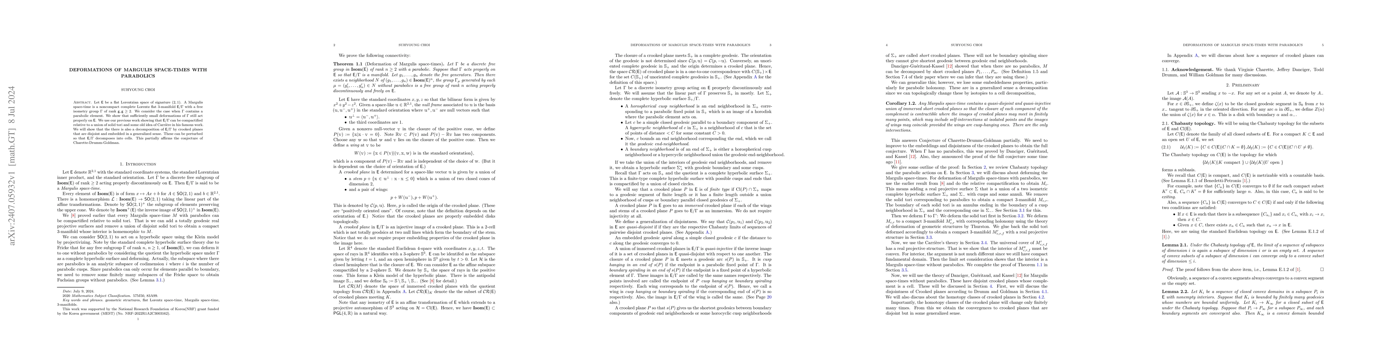 Let $E$ be a flat Lorentzian space of signature $(2, 1)$. A Margulis space-time is a noncompact complete Lorentz flat $3$-manifold $E/\Gamma$ with a free isometry group $\Gamma$ of rank $g \geq 2$. We consider the case when $\Gamma$ contains a parabolic element. We show that sufficiently small deformations of $\Gamma$ still act properly on $E$. We use our previous work showing that $E/\Gamma$ can be compactified relative to a union of solid tori and some old idea of Carri\`ere in his famous work. We will show that the there is also a decomposition of $E/\Gamma$ by crooked planes that are disjoint and embedded in a generalized sense. These can be perturbed so that $E/\Gamma$ decomposes into cells. This partially affirms the conjecture of Charette-Drumm-Goldman.