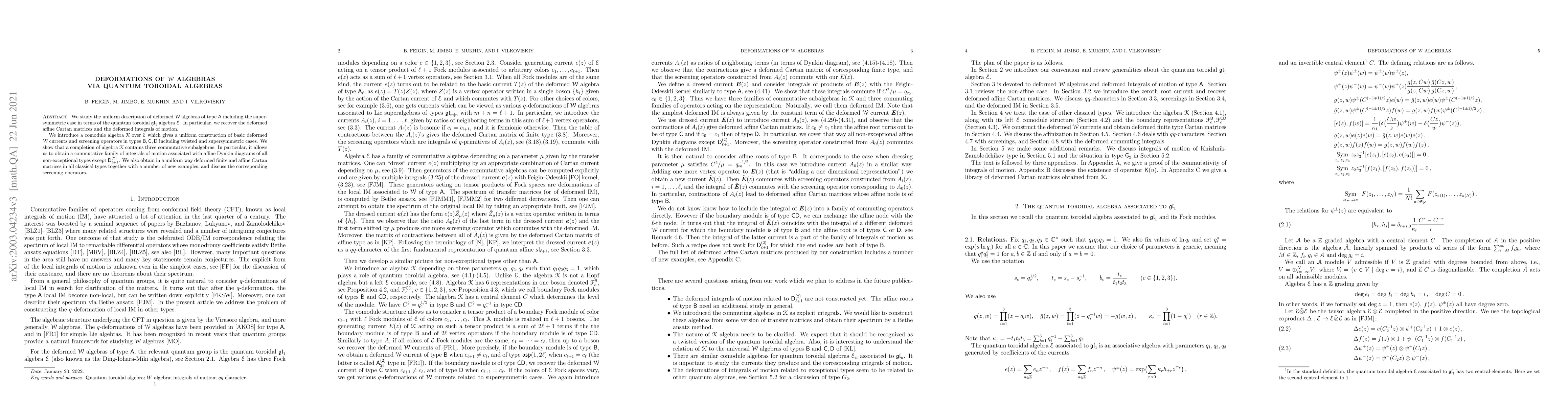 The deformed $\mathcal W$ algebras of type $\textsf{A}$ have a uniform description in terms of the quantum toroidal $\mathfrak{gl}_1$ algebra $\mathcal E$. We introduce a comodule algebra $\mathcal K$ over $\mathcal E$ which gives a uniform construction of basic deformed $\mathcal W$ currents and screening operators in types $\textsf{B},\textsf{C},\textsf{D}$ including twisted and supersymmetric cases. We show that a completion of algebra $\mathcal K$ contains three commutative subalgebras. In particular, it allows us to obtain a commutative family of integrals of motion associated with affine Dynkin diagrams of all non-exceptional types except $\textsf{D}^{(2)}_{\ell+1}$. We also obtain in a uniform way deformed finite and affine Cartan matrices in all classical types together with a number of new examples, and discuss the corresponding screening operators.