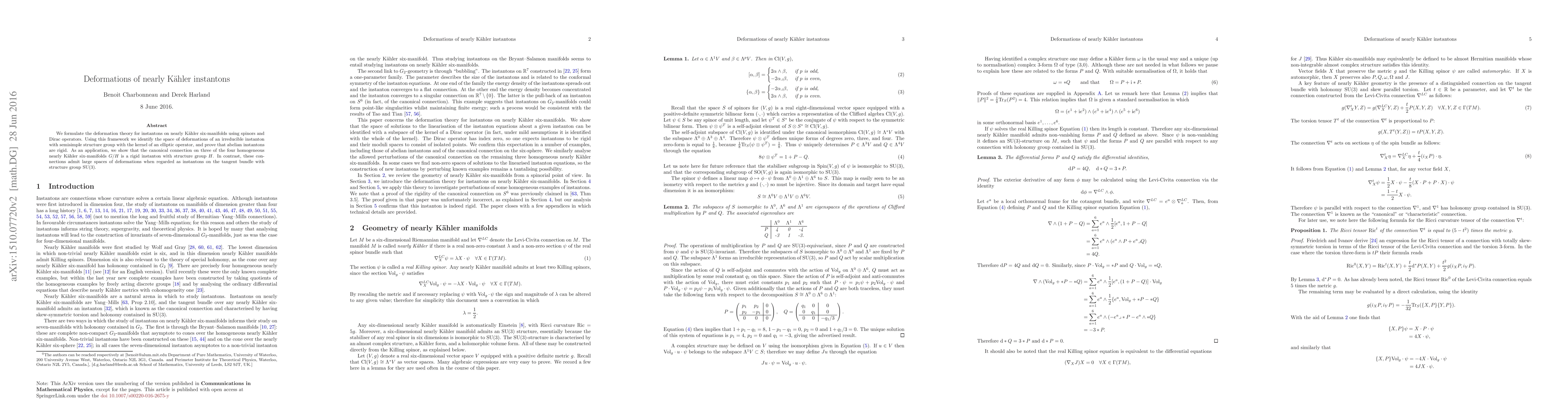 This paper develops a deformation theory for instantons on nearly Kähler six-manifolds, showing that abelian instantons are rigid and identifying the deformation space as the kernel of an elliptic operator. It concludes by proving the rigidity of the canonical connection on three specific homogeneous nearly Kähler manifolds.