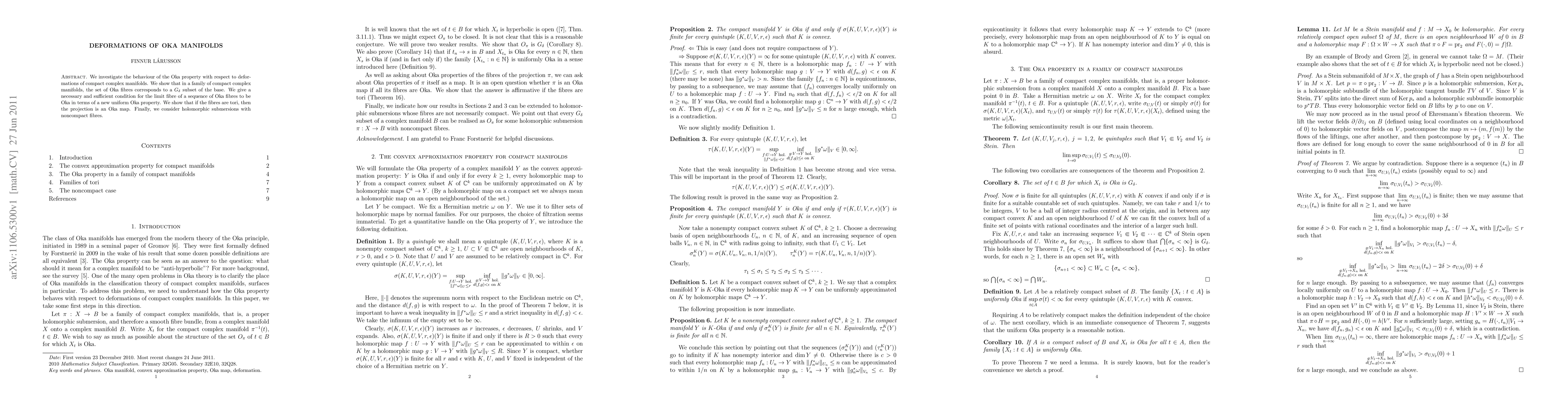 This paper examines how the Oka property behaves under deformations of compact complex manifolds, proving that the set of Oka fibres forms a G-delta subset in the base. It provides a new condition ensuring the limit fibre of a sequence of Oka fibres remains Oka and discusses the projection being an Oka map when fibres are tori.