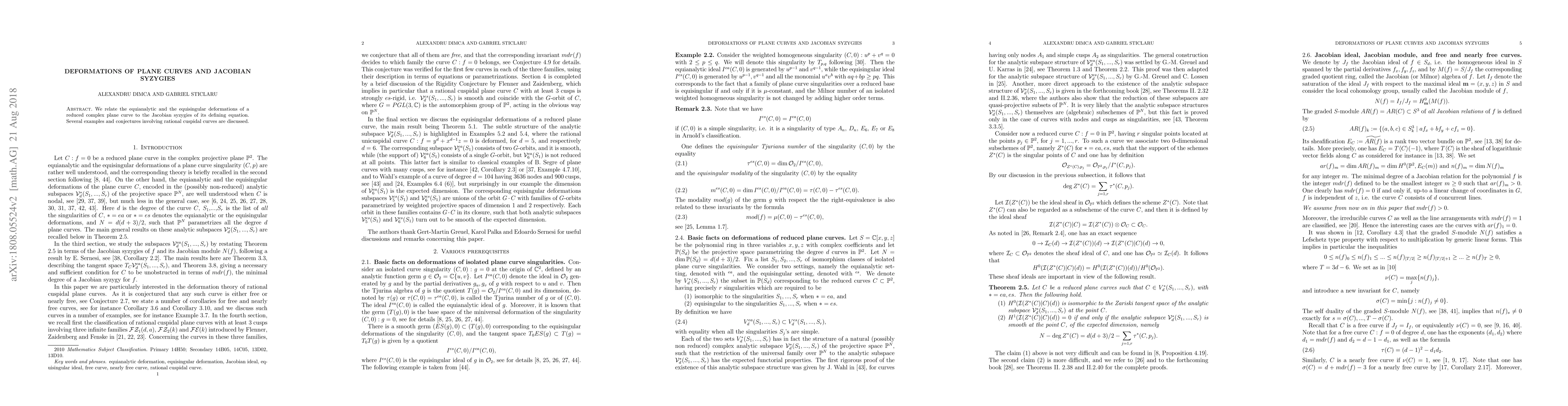 The paper examines the relationship between equianalytic and equisingular deformations of reduced complex plane curves and Jacobian syzygies of their defining equations, with examples and conjectures involving rational cuspidal curves.
