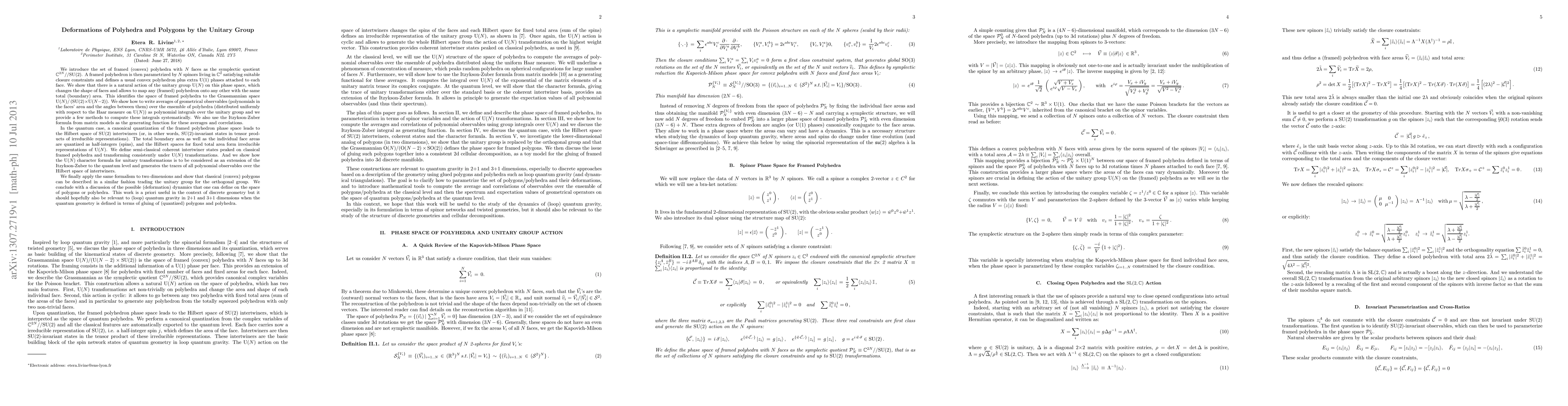 This paper explores the deformations of framed convex polyhedra and polygons via the unitary group U(N), establishing an isomorphism between the space of framed polyhedra and the Grassmannian space U(N)/SU(2)*U(N-2). It also quantizes the geometry, linking classical deformations to the Hilbert space of SU(2) intertwiners and discussing potential applications in loop quantum gravity.