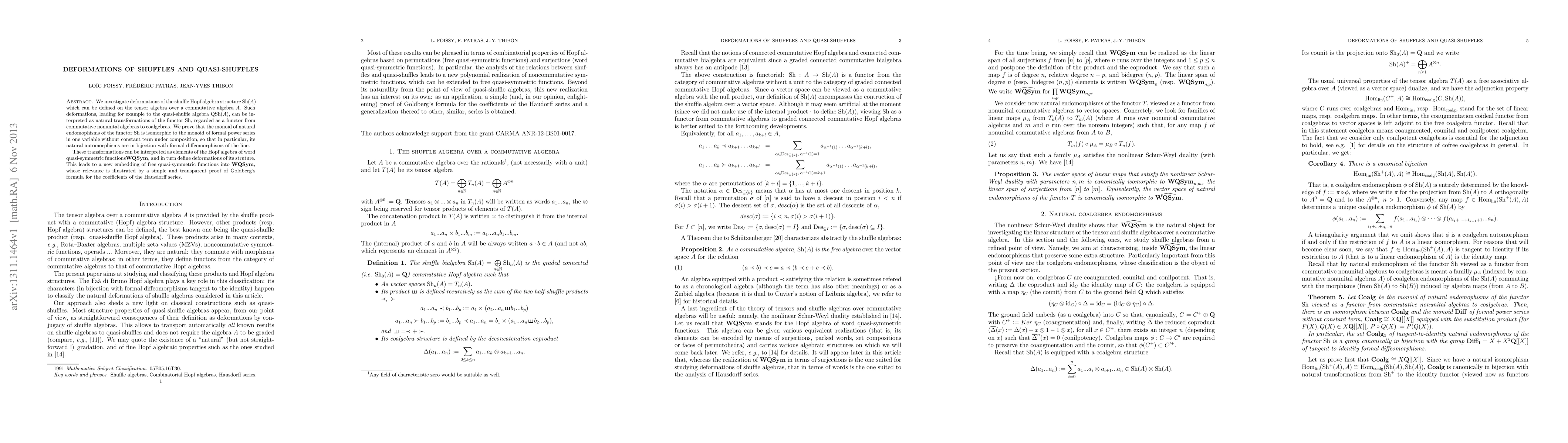 We investigate deformations of the shuffl e Hopf algebra structure Sh(A) which can be de fined on the tensor algebra over a commutative algebra A. Such deformations, leading for example to the quasi-shuffl e algebra QSh(A), can be interpreted as natural transformations of the functor Sh, regarded as a functor from commutative nonunital algebras to coalgebras. We prove that the monoid of natural endomophisms of the functor Sh is isomorphic to the monoid of formal power series in one variable without constant term under composition, so that in particular, its natural automorphisms are in bijection with formal diffeomorphisms of the line. These transformations can be interpreted as elements of the Hopf algebra of word quasi-symmetric functions WQSym, and in turn de fine deformations of its structure. This leads to a new embedding of free quasi-symmetric functions into WQSym, whose relevance is illustrated by a simple and transparent proof of Goldberg's formula for the coe cients of the Hausdorff series.
