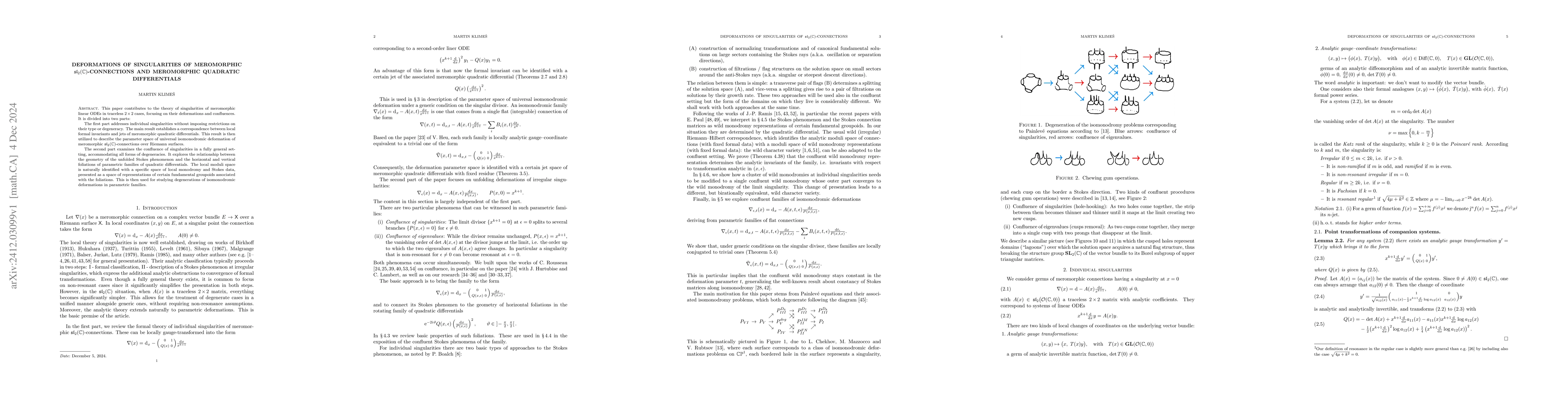 This paper investigates the deformations and confluences of singularities in meromorphic linear ODEs, establishing a link between local formal invariants and meromorphic quadratic differentials, and examining the geometry of unfolded Stokes phenomena in relation to foliations of quadratic differentials.