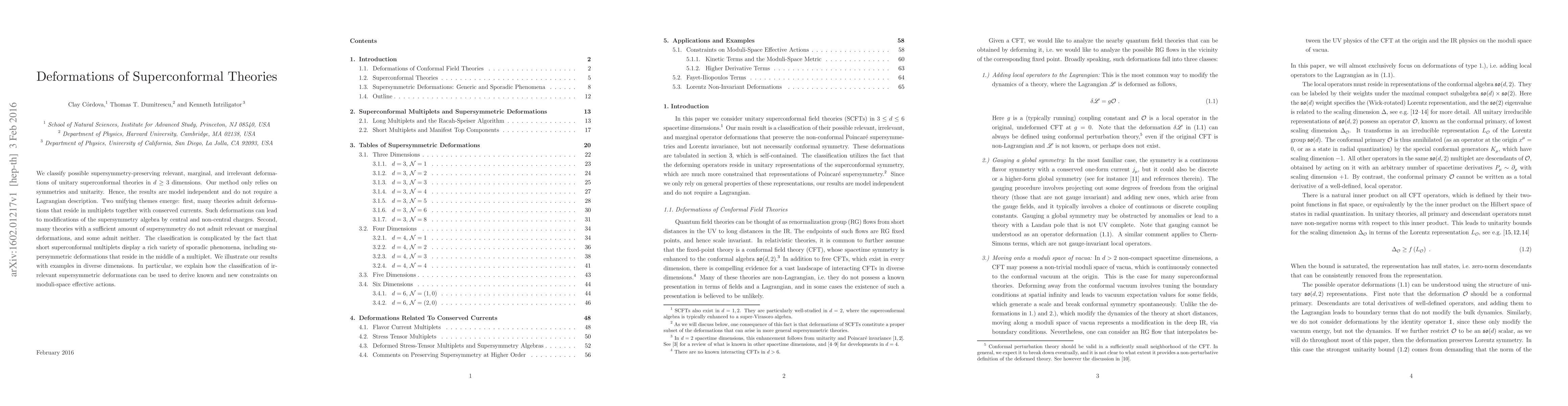 We classify possible supersymmetry-preserving relevant, marginal, and irrelevant deformations of unitary superconformal theories in $d \geq 3$ dimensions. Our method only relies on symmetries and unitarity. Hence, the results are model independent and do not require a Lagrangian description. Two unifying themes emerge: first, many theories admit deformations that reside in multiplets together with conserved currents. Such deformations can lead to modifications of the supersymmetry algebra by central and non-central charges. Second, many theories with a sufficient amount of supersymmetry do not admit relevant or marginal deformations, and some admit neither. The classification is complicated by the fact that short superconformal multiplets display a rich variety of sporadic phenomena, including supersymmetric deformations that reside in the middle of a multiplet. We illustrate our results with examples in diverse dimensions. In particular, we explain how the classification of irrelevant supersymmetric deformations can be used to derive known and new constraints on moduli-space effective actions.