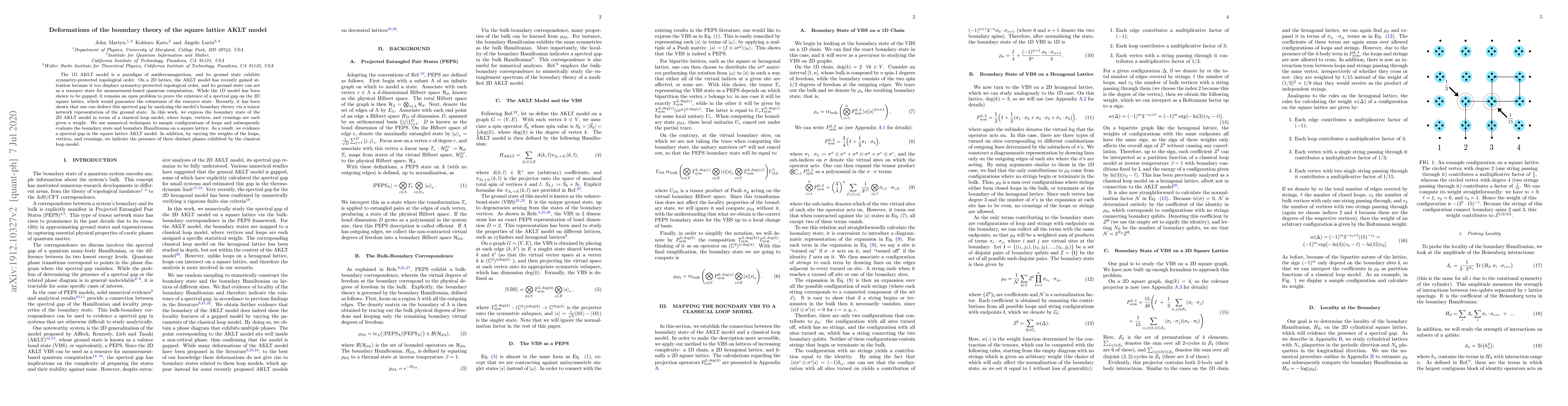 This paper presents a method to prove a spectral gap in the 2D square lattice AKLT model, crucial for its robustness as a quantum computation resource state. By representing the boundary state as a classical loop model, numerical techniques are used to demonstrate the gap and identify three distinct phases based on varying weights of loops, vertices, and crossings.