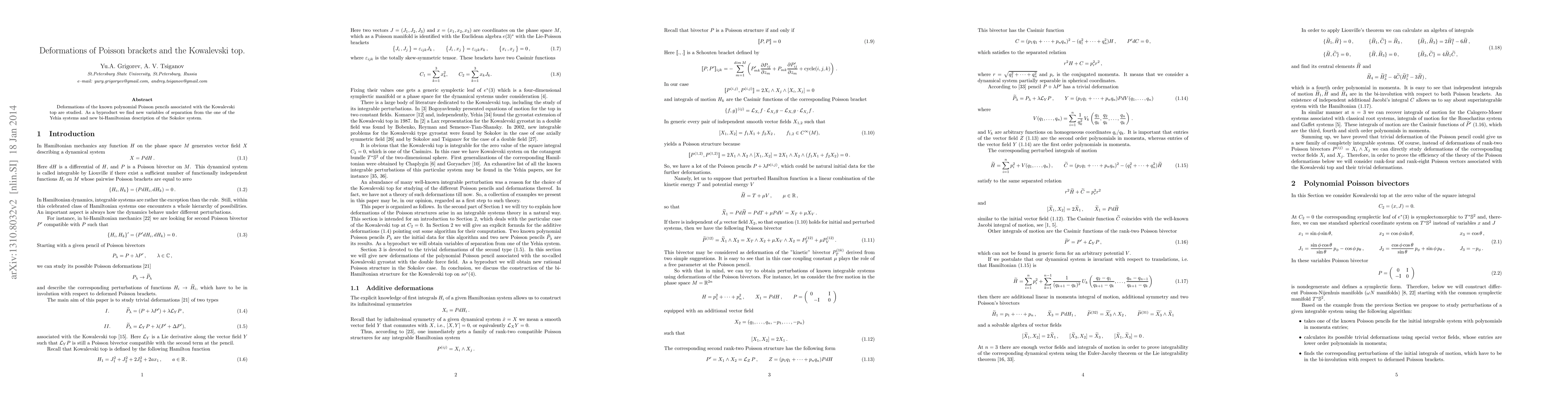This paper investigates deformations of Poisson brackets linked to the Kowalevski top, discovering new separation variables from Yehia systems and presenting a new bi-Hamiltonian framework for an integrable deformation of the Kowalevski gyrostat in two fields, as initially proposed by Sokolov and Tsiganov.