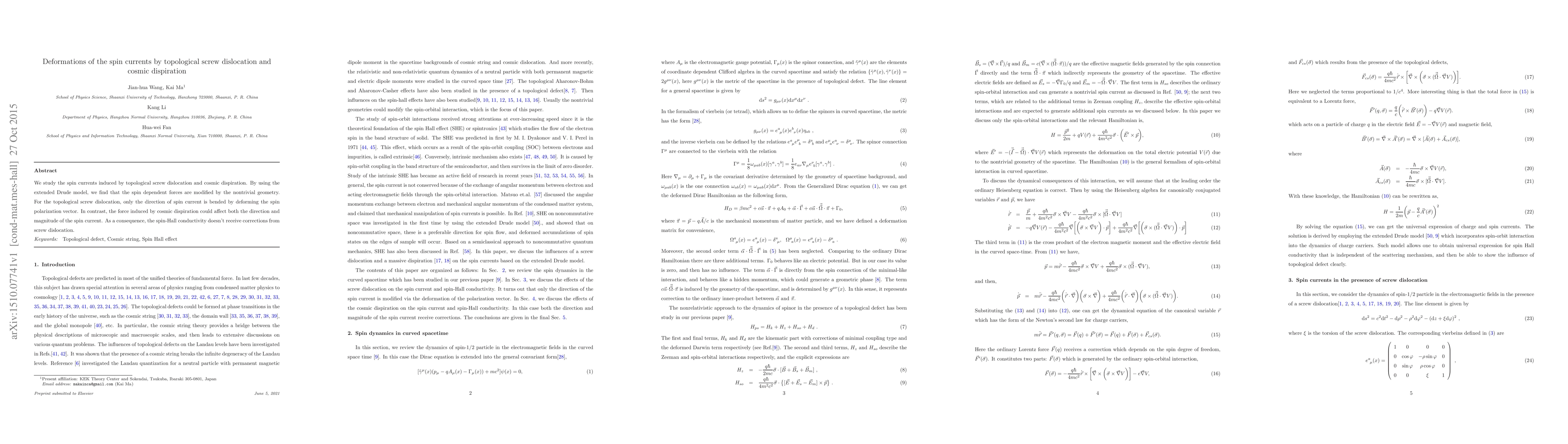 We study the spin currents induced by topological screw dislocation and cosmic dispiration. By using the extended Drude model, we find that the spin dependent forces are modified by the nontrivial geometry. For the topological screw dislocation, only the direction of spin current is bended by deforming the spin polarization vector. In contrast, the force induced by cosmic dispiration could affect both the direction and magnitude of the spin current. As a consequence, the spin-Hall conductivity doesn't receive corrections from screw dislocation.
