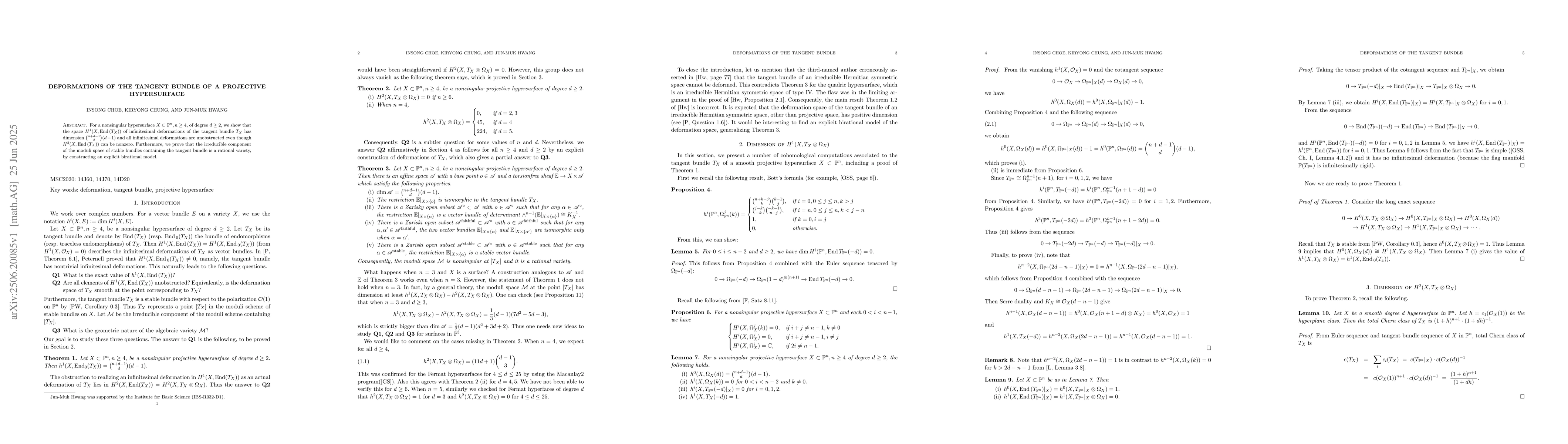 The paper demonstrates that for a nonsingular hypersurface in projective space of high enough dimension, the space of infinitesimal deformations of its tangent bundle has a specific dimension, and all these deformations are unobstructed, despite possible nonzero second cohomology group. It also establishes that the moduli space component containing the tangent bundle is a rational variety, supported by a constructed explicit birational model.