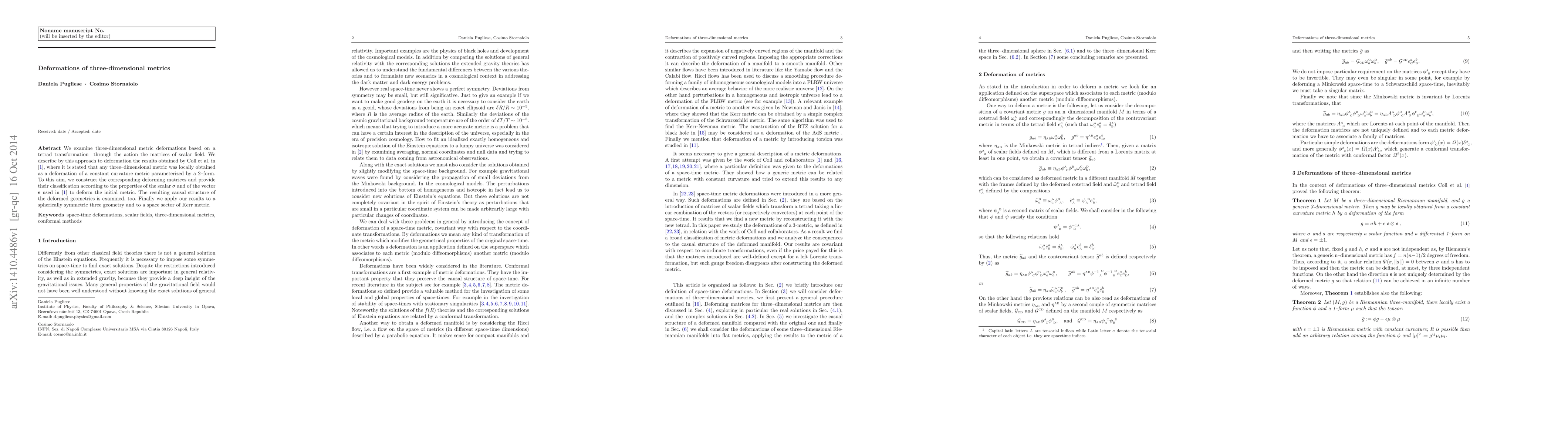 We examine three-dimensional metric deformations based on a tetrad transformation through the action the matrices of scalar fields. We describe by this approach to deformation the results obtained by Coll et al. in [1], where it is stated that any three--dimensional metric was locally obtained as a deformation of a constant curvature metric parameterized by a 2--form.To this aim, we construct the corresponding deforming matrices and provide their classification according to the properties of the scalar $\sigma$ and of the vector $\mathbf{s}$ used in [1] to deform the initial metric. The resulting causal structure of the deformed geometries is examined, too.Finally we apply our results to a spherically symmetric three geometry and to a space sector of Kerr metric.