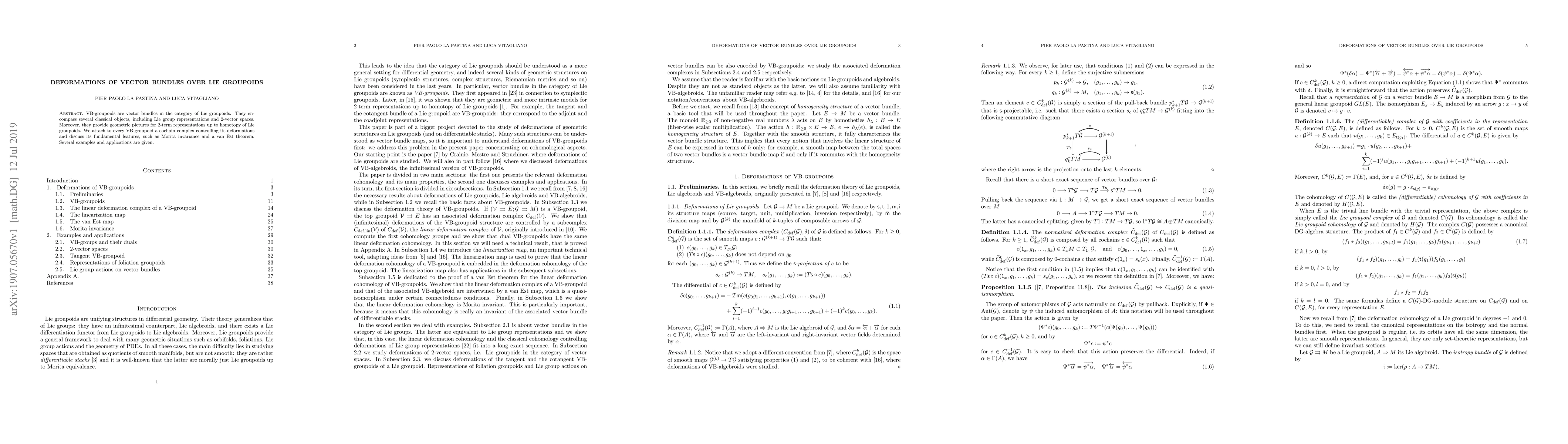 This paper explores vector bundles over Lie groupoids, known as VB-groupoids, which generalize classical objects like Lie group representations. It constructs a cochain complex to control their deformations, highlighting Morita invariance and a van Est theorem, and provides several examples and applications.