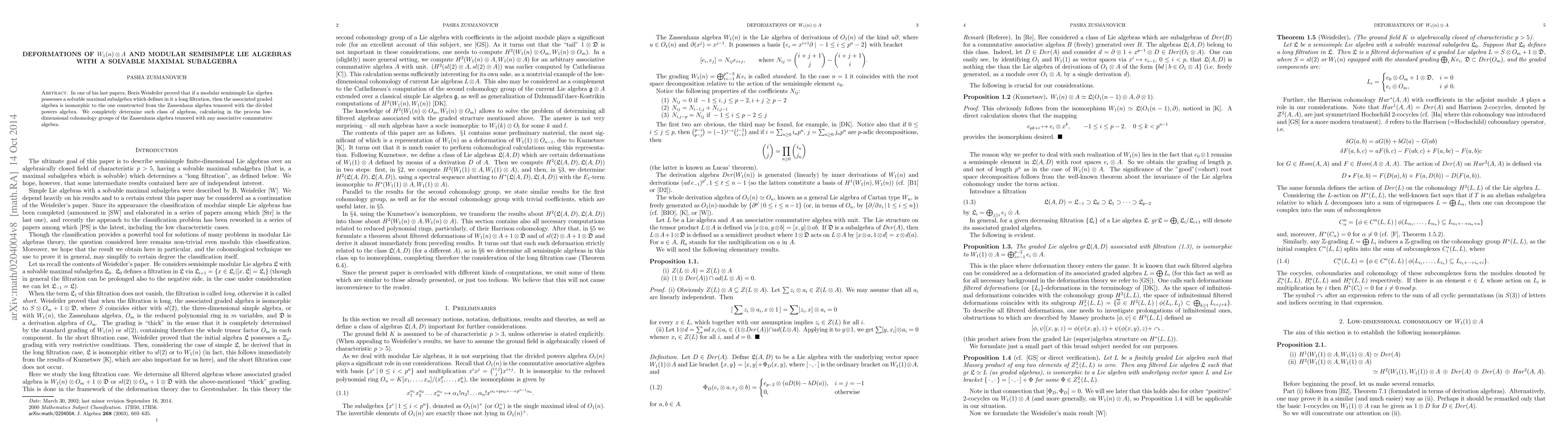 In one of his last papers, Boris Weisfeiler proved that if modular semisimple Lie algebra possesses a solvable maximal subalgebra which defines in it a long filtration, then associated graded algebra is isomorphic to one constructed from the Zassenhaus algebra tensored with the divided powers algebra. We completely determine such class of algebras, calculating in process low-dimensional cohomology groups of Zassenhaus algebra tensored with any associative commutative algebra.