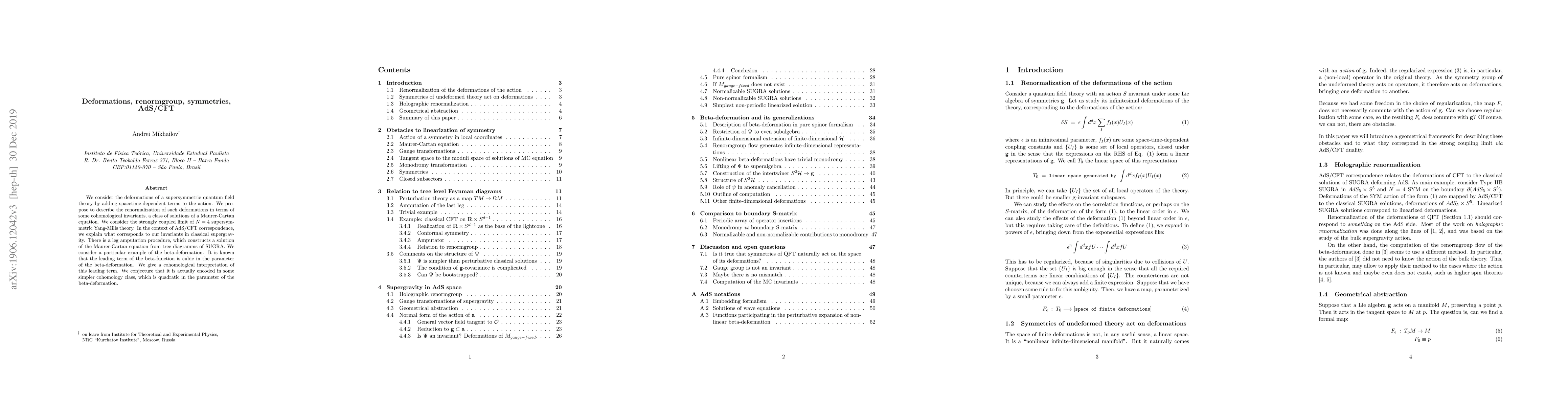 We consider the deformations of a supersymmetric quantum field theory by adding spacetime-dependent terms to the action. We propose to describe the renormalization of such deformations in terms of some cohomological invariants, a class of solutions of a Maurer-Cartan equation. We consider the strongly coupled limit of $N=4$ supersymmetric Yang-Mills theory. In the context of AdS/CFT correspondence, we explain what corresponds to our invariants in classical supergravity. There is a leg amputation procedure, which constructs a solution of the Maurer-Cartan equation from tree diagramms of SUGRA. We consider a particular example of the beta-deformation. It is known that the leading term of the beta-function is cubic in the parameter of the beta-deformation. We give a cohomological interpretation of this leading term. We conjecture that it is actually encoded in some simpler cohomology class, which is quadratic in the parameter of the beta-deformation.