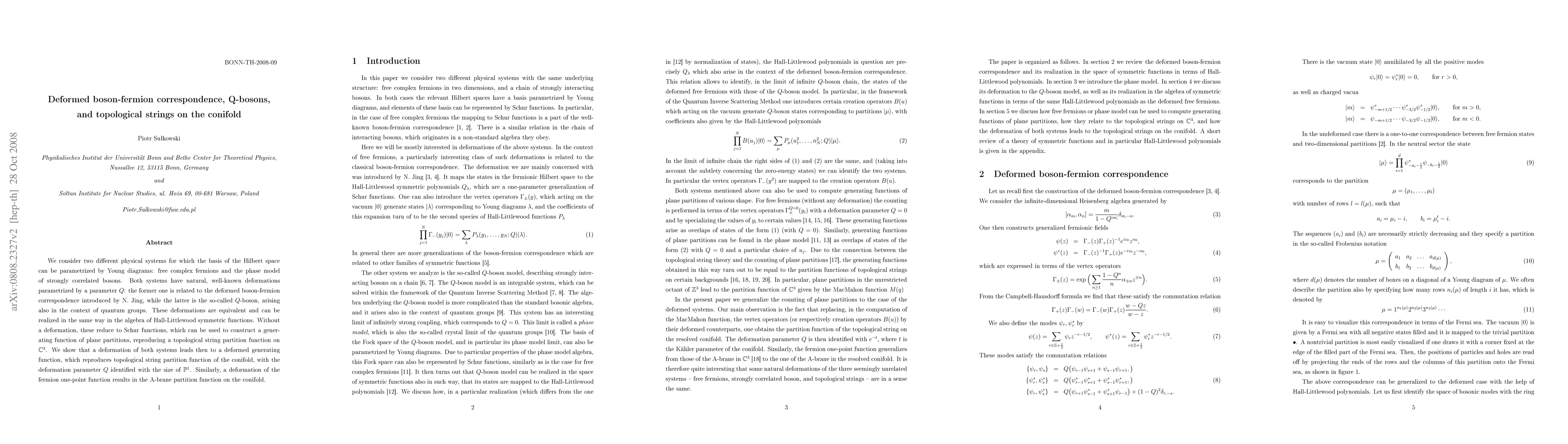 This paper explores the equivalence between deformed boson-fermion correspondence and Q-bosons, showing their realization in Hall-Littlewood symmetric functions. It demonstrates how deformations lead to topological string partition functions on the conifold, connecting the deformation parameter Q to the size of $P^1$.