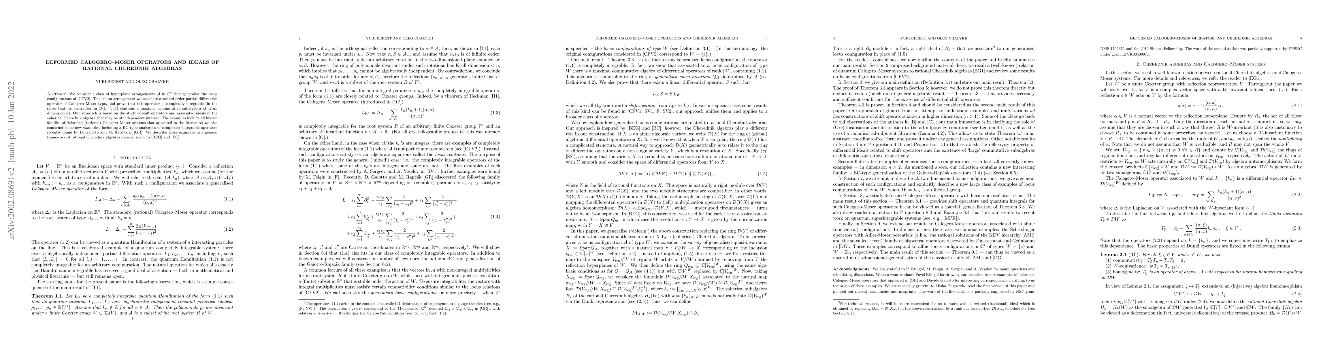 We consider a class of hyperplane arrangements $\mathcal A$ in ${\mathbb C}^n$ that generalise the locus configurations of \cite{CFV}. To such an arrangement we associate a second order partial differential operator of Calogero-Moser type, and prove that this operator is completely integrable (in the sense that its centraliser in $\mathcal{D}({\mathbb C}^n\setminus\mathcal A)$ contains a maximal commutative subalgebra of Krull dimension $n$). Our approach is based on the study of shift operators and associated ideals in the spherical Cherednik algebra that may be of independent interest. The examples include all known families of deformed (rational) Calogero-Moser systems that appeared in the literature; we also construct some new examples, including a BC-type analogues of completely integrable operators recently found by D. Gaiotto and M. Rap\v{c}\'ak in \cite{GR}. We describe these examples in a general framework of rational Cherednik algebras close in spirit to \cite{BEG} and \cite{BC}.