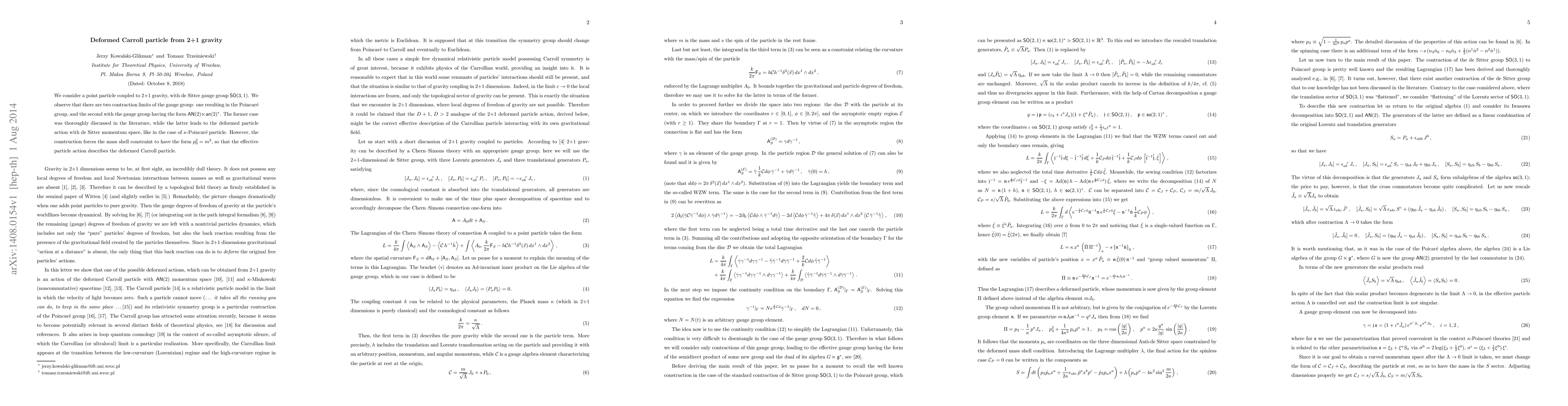 This research explores a point particle interacting with 2+1 gravity under de Sitter gauge group SO(3,1), identifying two contraction limits. One results in the Poincare group, extensively studied, while the other yields a deformed particle action with de Sitter momentum space, reminiscent of kappa-Poincare particle. The mass shell constraint, however, enforces p_0^2 = m^2, describing a deformed Carroll particle through its effective action.