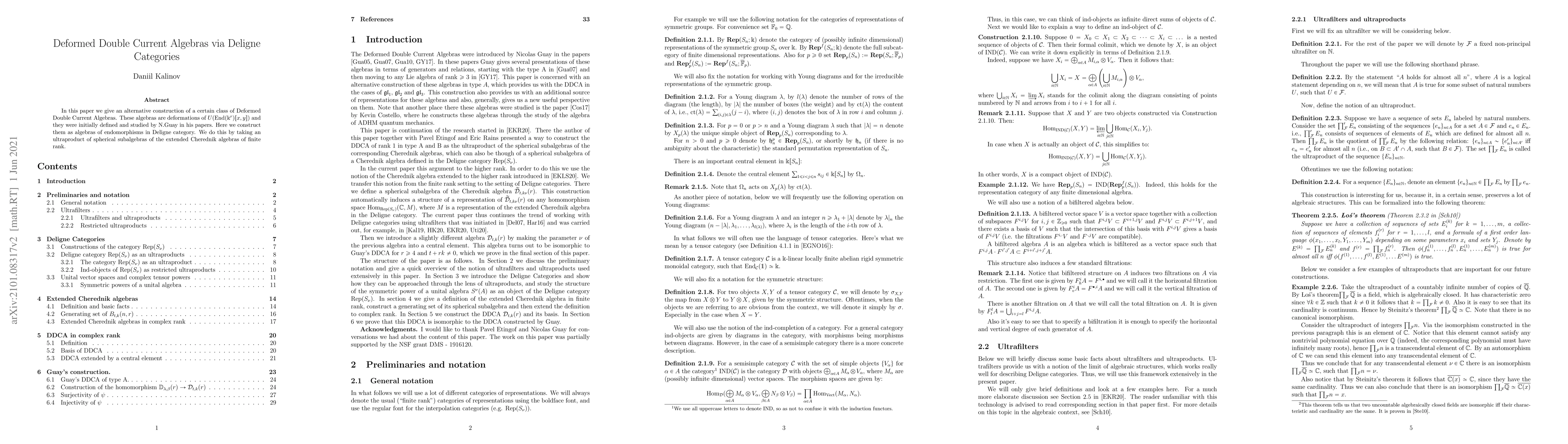 In this paper we give an alternative construction of a certain class of Deformed Double Current Algebras. These algebras are deformations of $U({\rm End}(\Bbbk^r)[x,y])$ and they were initially defined and studied by N.Guay in his papers. Here we construct them as algebras of endomorphisms in Deligne category. We do this by taking an ultraproduct of spherical subalgebras of the extended Cherednik algebras of finite rank.