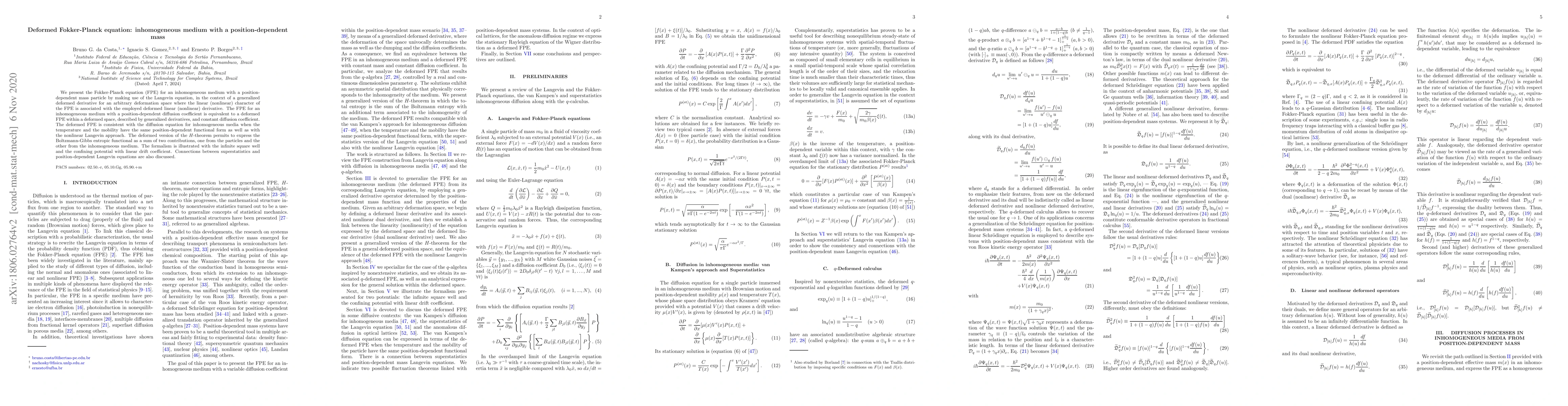 We present the Fokker-Planck equation (FPE) for an inhomogeneous medium with a position-dependent mass particle by making use of the Langevin equation, in the context of a generalized deformed derivative for an arbitrary deformation space where the linear (nonlinear) character of the FPE is associated with the employed deformed linear (nonlinear) derivative. The FPE for an inhomogeneous medium with a position-dependent diffusion coefficient is equivalent to a deformed FPE within a deformed space, described by generalized derivatives, and constant diffusion coefficient. The deformed FPE is consistent with the diffusion equation for inhomogeneous media when the temperature and the mobility have the same position-dependent functional form as well as with the nonlinear Langevin approach. The deformed version of the H-theorem permits to express the Boltzmann-Gibbs entropic functional as a sum of two contributions, one from the particles and the other from the inhomogeneous medium. The formalism is illustrated with the infinite square well and the confining potential with linear drift coefficient. Connections between superstatistics and position-dependent Langevin equations are also discussed.