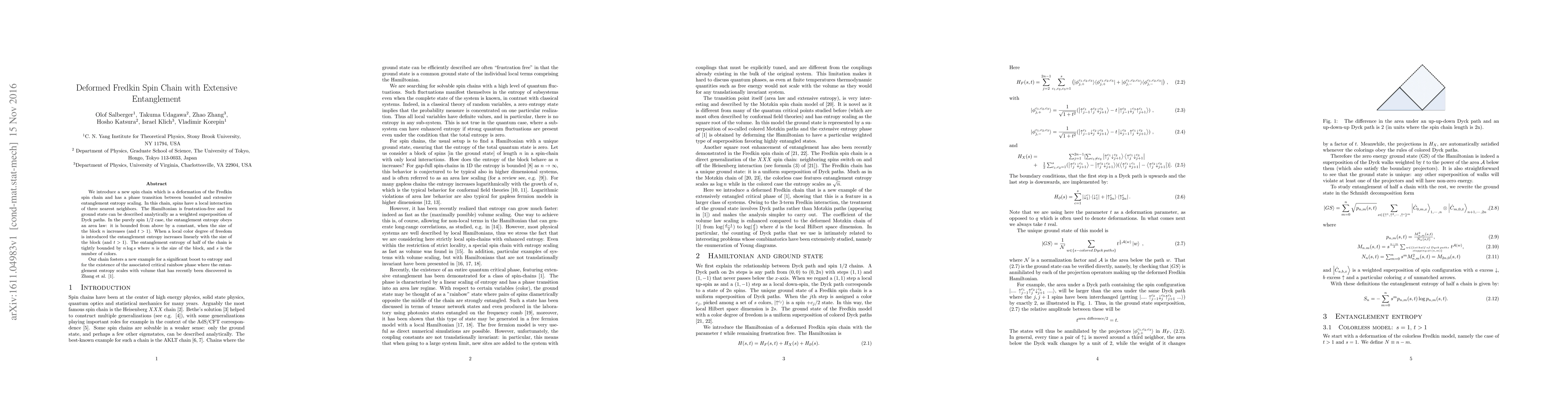 We introduce a new spin chain which is a deformation of the Fredkin spin chain and has a phase transition between bounded and extensive entanglement entropy scaling. In this chain, spins have a local interaction of three nearest neighbors. The Hamiltonian is frustration-free and its ground state can be described analytically as a weighted superposition of Dyck paths. In the purely spin $1/2$ case, the entanglement entropy obeys an area law: it is bounded from above by a constant, when the size of the block $n$ increases (and $t>1$). When a local color degree of freedom is introduced the entanglement entropy increases linearly with the size of the block (and $t>1$). The entanglement entropy of half of the chain is tightly bounded by ${ n}\log s$ where $n$ is the size of the block, and $s$ is the number of colors. Our chain fosters a new example for a significant boost to entropy and for the existence of the associated critical rainbow phase where the entanglement entropy scales with volume that has recently been discovered in Zhang et al. (arXiv:1606.07795)