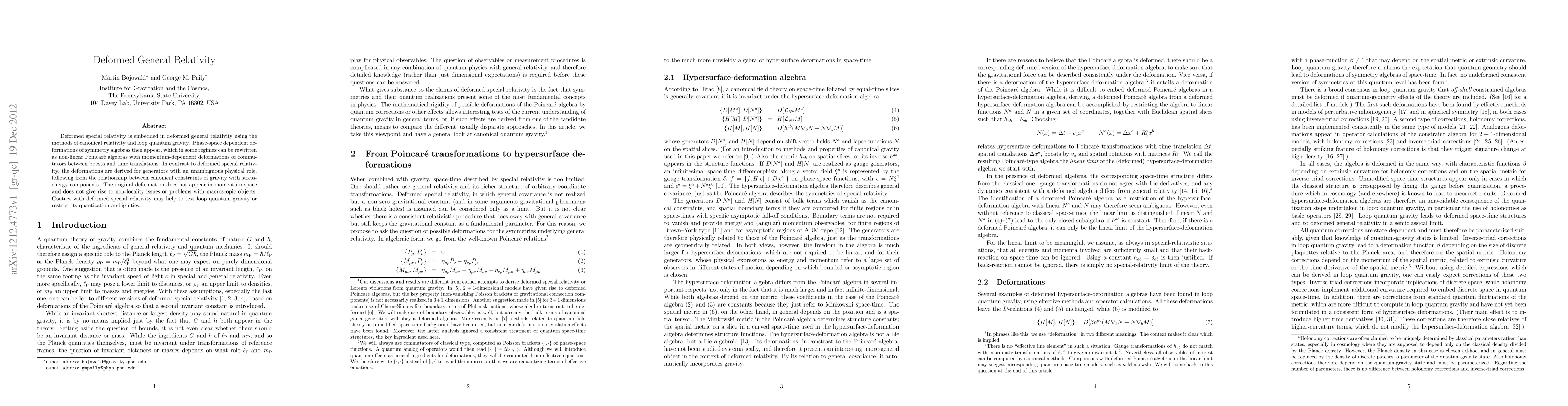 Deformed special relativity is embedded in deformed general relativity using the methods of canonical relativity and loop quantum gravity. Phase-space dependent deformations of symmetry algebras then appear, which in some regimes can be rewritten as non-linear Poincare algebras with momentum-dependent deformations of commutators between boosts and time translations. In contrast to deformed special relativity, the deformations are derived for generators with an unambiguous physical role, following from the relationship between canonical constraints of gravity with stress-energy components. The original deformation does not appear in momentum space and does not give rise to non-locality issues or problems with macroscopic objects. Contact with deformed special relativity may help to test loop quantum gravity or restrict its quantization ambiguities.