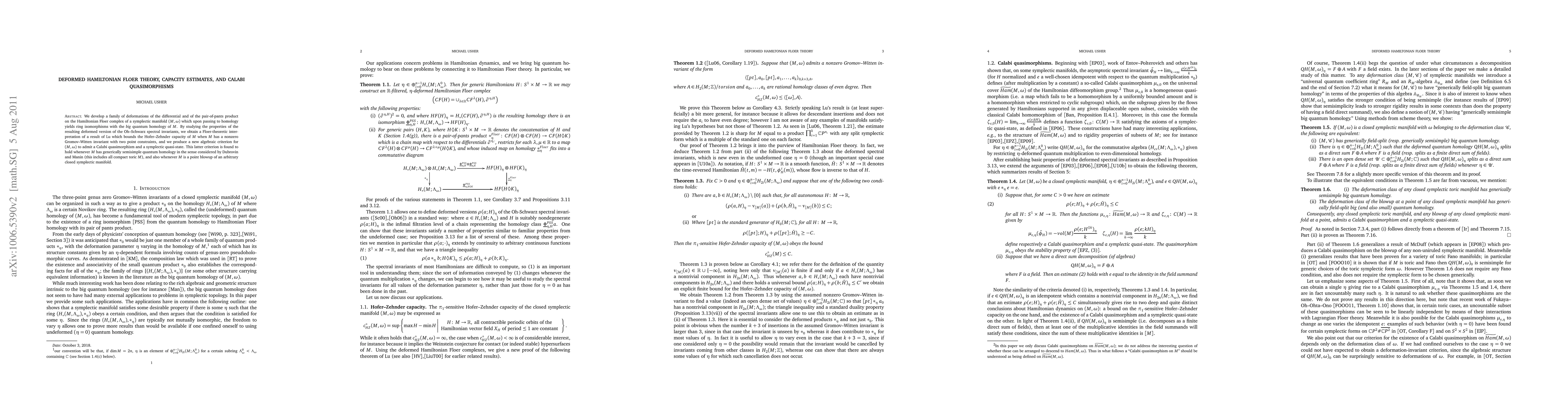 We develop a family of deformations of the differential and of the pair-of-pants product on the Hamiltonian Floer complex of a symplectic manifold (M,\omega) which upon passing to homology yields ring isomorphisms with the big quantum homology of M. By studying the properties of the resulting deformed version of the Oh-Schwarz spectral invariants, we obtain a Floer-theoretic interpretation of a result of Lu which bounds the Hofer-Zehnder capacity of M when M has a nonzero Gromov-Witten invariant with two point constraints, and we produce a new algebraic criterion for (M,\omega) to admit a Calabi quasimorphism and a symplectic quasi-state. This latter criterion is found to hold whenever M has generically semisimple quantum homology in the sense considered by Dubrovin and Manin (this includes all compact toric M), and also whenever M is a point blowup of an arbitrary closed symplectic manifold.