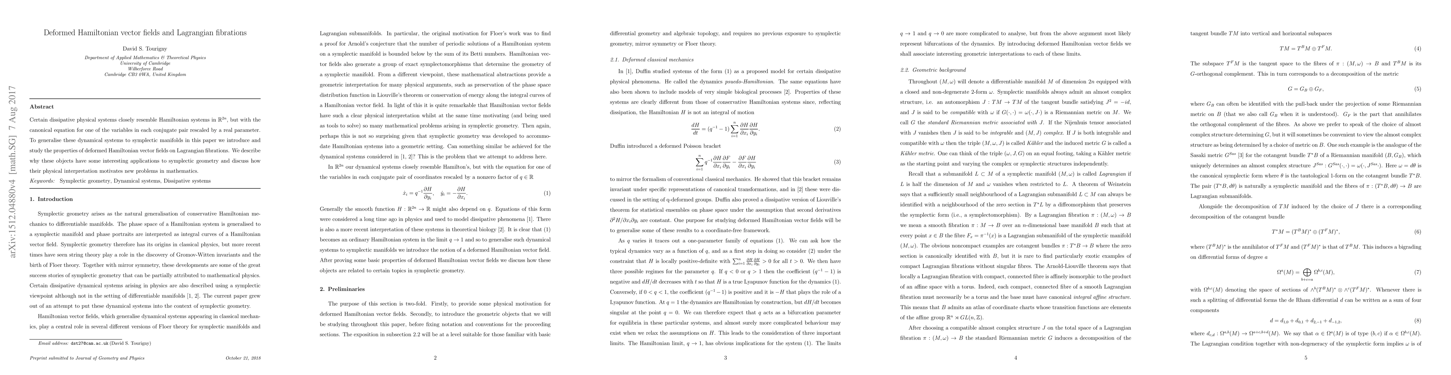 The paper introduces deformed Hamiltonian vector fields on Lagrangian fibrations to generalize dissipative systems resembling Hamiltonian systems, exploring their implications for symplectic geometry and motivating new mathematical problems. These fields offer intriguing applications in understanding the dynamics of such systems and bridging physics and mathematics.