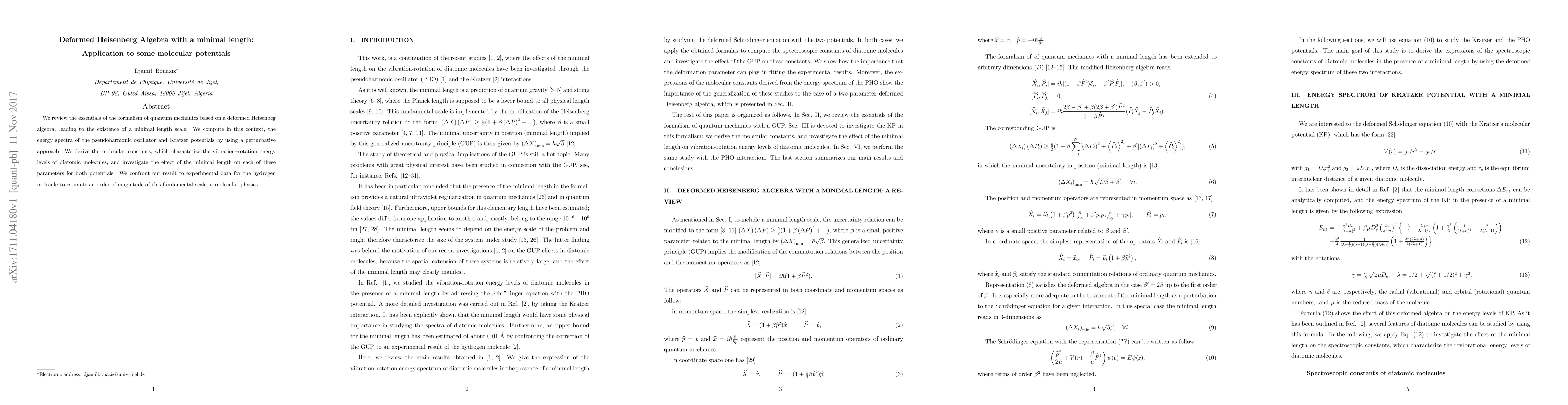 Summary: This paper reviews the quantum mechanics based on deformed Heisenberg algebra with a minimal length scale, calculating energy spectra for pseudoharmonic and Kratzer potentials. It derives molecular constants for diatomic molecules, examines the minimal length's effect, and compares results to experimental data for the hydrogen molecule to estimate this scale's magnitude.
