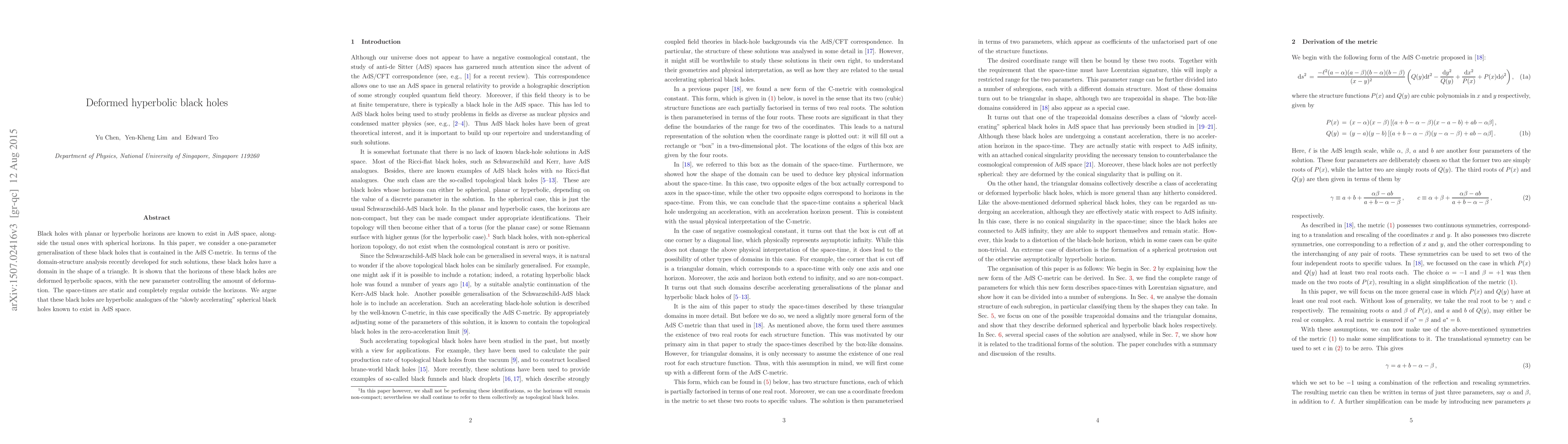 This paper explores a one-parameter generalization of hyperbolic black holes in AdS space, showing that their horizons are deformed hyperbolic spaces. These static, regular space-times outside the horizons are analogous to "slowly accelerating" spherical black holes in AdS.