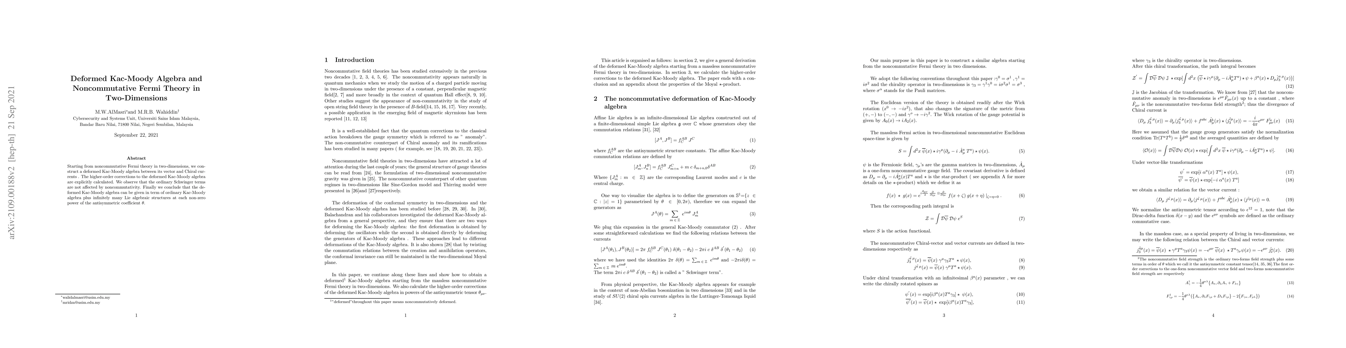 Starting from noncommutative Fermi theory in two-dimensions, we construct a deformed Kac-Moody algebra between its vector and Chiral currents . The higher-order corrections to the deformed Kac-Moody algebra are explicitly calculated. We observe that the ordinary Schwinger terms are not affected by noncommutativity. Finally we conclude that the deformed Kac-Moody algebra can be given in term of ordinary Kac-Moody algebra plus infinitely many Lie algebraic structures at each non-zero power of the antisymmetric coefficient $\theta$.