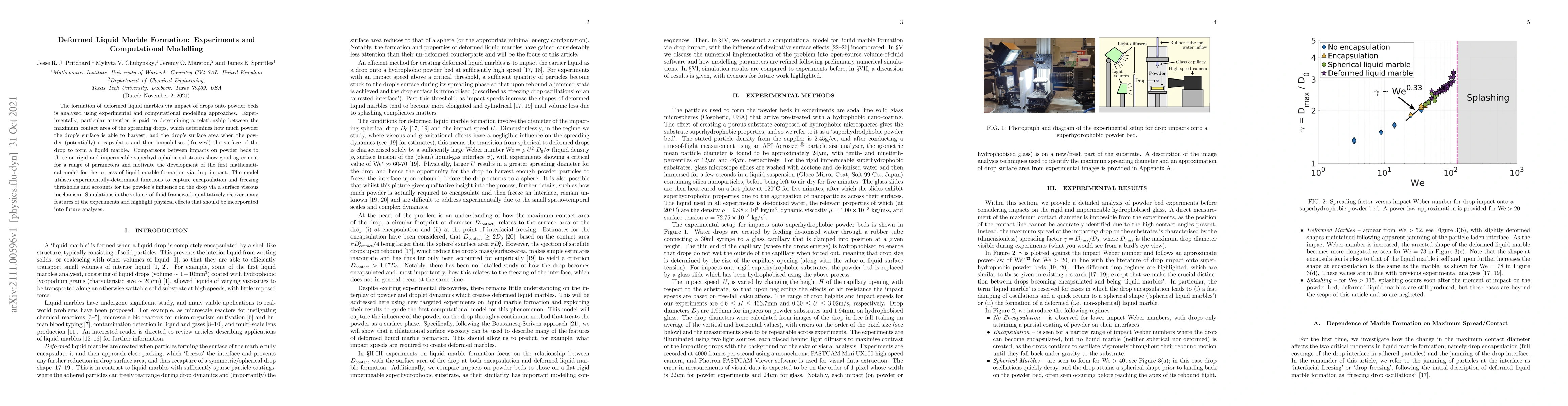 The formation of deformed liquid marbles via impact of drops onto powder beds is analysed using experimental and computational modelling approaches. Experimentally, particular attention is paid to determining a relationship between the maximum contact area of the spreading drops, which determines how much powder the drop's surface is able to harvest, and the drop's surface area when the powder (potentially) encapsulates and then immobilises (`freezes') the surface of the drop to form a liquid marble. Comparisons between impacts on powder beds to those on rigid and impermeable superhydrophobic substrates show good agreement for a range of parameters and motivate the development of the first mathematical model for the process of liquid marble formation via drop impact. The model utilises experimentally-determined functions to capture encapsulation and freezing thresholds and accounts for the powder's influence on the drop via a surface viscous mechanism. Simulations in the volume-of-fluid framework qualitatively recover many features of the experiments and highlight physical effects that should be incorporated into future analyses.