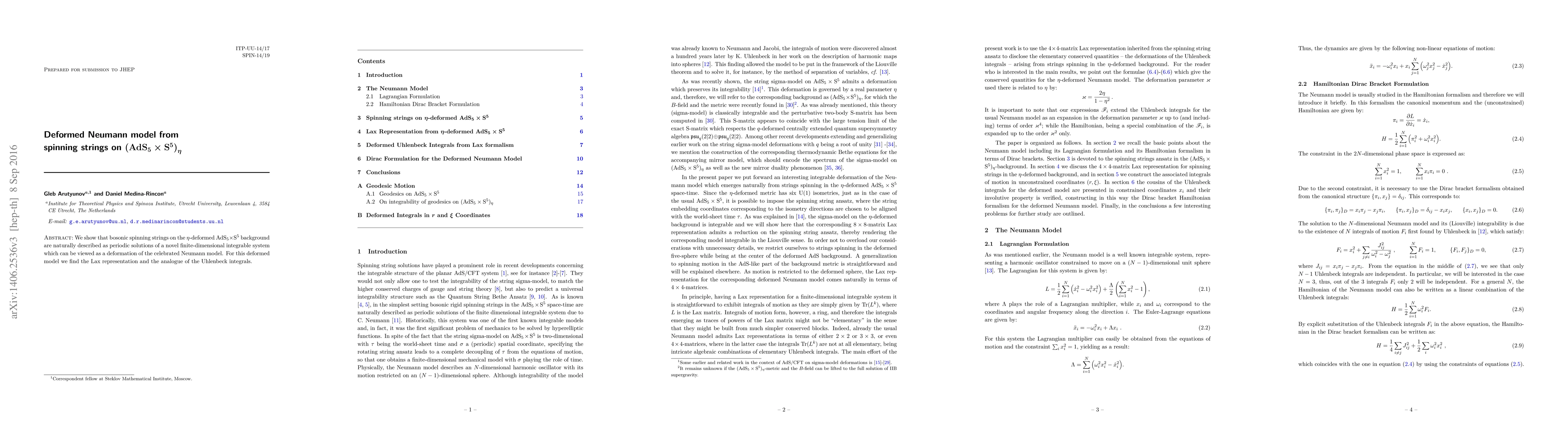 Summary: The paper demonstrates that spinning strings on a deformed AdS_5 x S^5 background correspond to periodic solutions of a novel integrable system, which is a deformation of the Neumann model, and presents its Lax representation and Uhlenbeck integrals.
