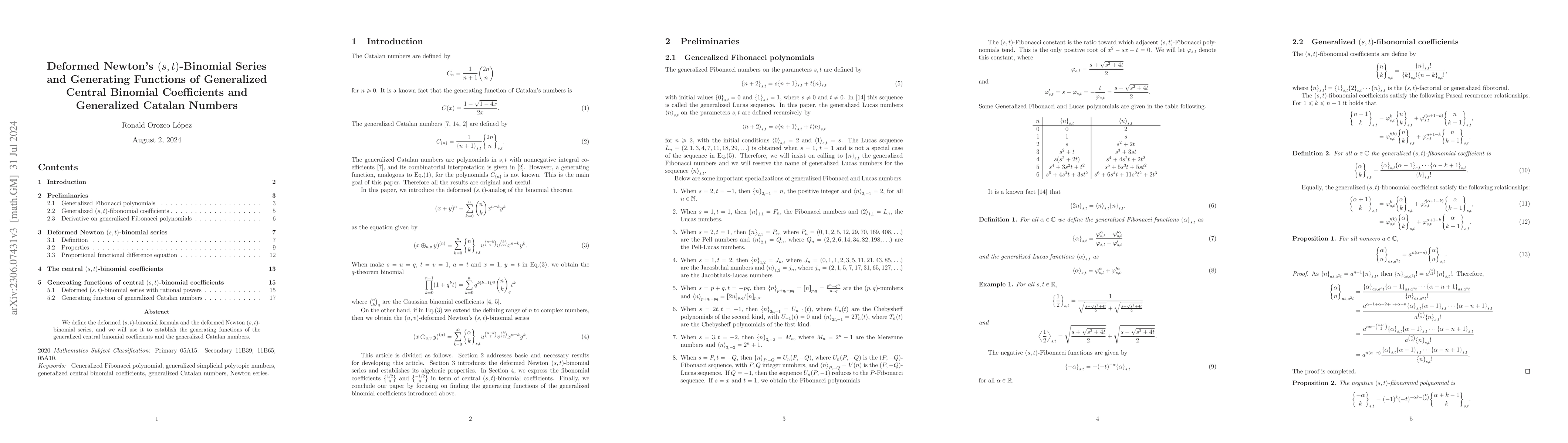We define the deformed $(s,t)$-binomial formula and the deformed Newton $(s,t)$-binomial series and we will use it to establish the generating functions of generalized simplicial polytopic numbers, generalized central binomial coefficients, and the generalized Catalan numbers. Furthermore, analogues of the Lehmer series are introduced.