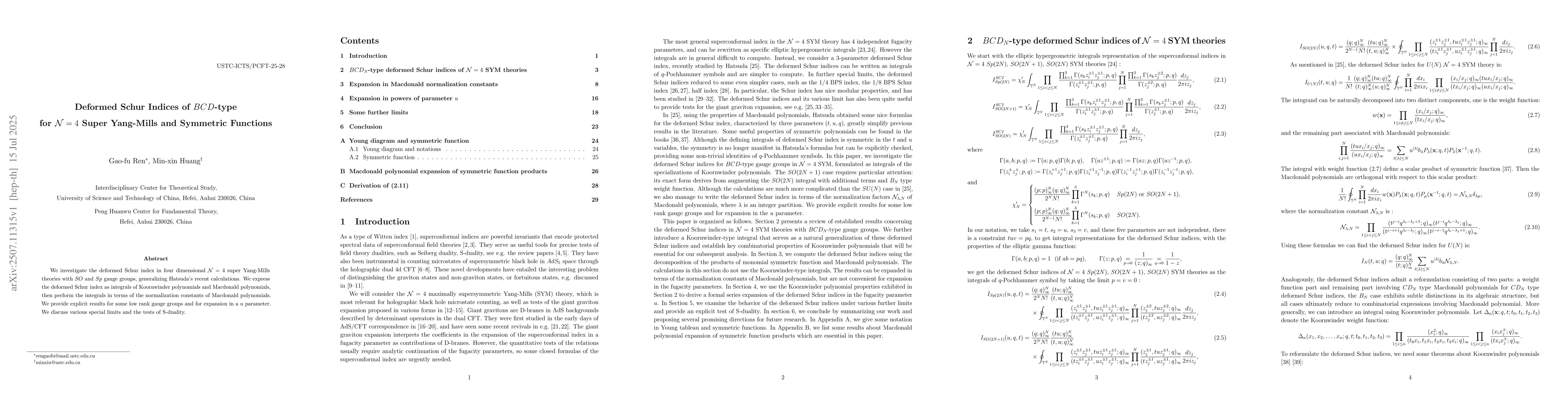 We investigate the deformed Schur index in four dimensional N=4 super Yang-Mills theories with $SO$ and $Sp$ gauge groups, generalizing Hatsuda's recent calculations. We express the deformed Schur index as integrals of Koornwinder polynomials and Macdonald polynomials, then perform the integrals in terms of the normalization constants of Macdonald polynomials. We provide explicit results for some low rank gauge groups and for expansion in a $u$ parameter. We discuss various special limits and the tests of S-duality.