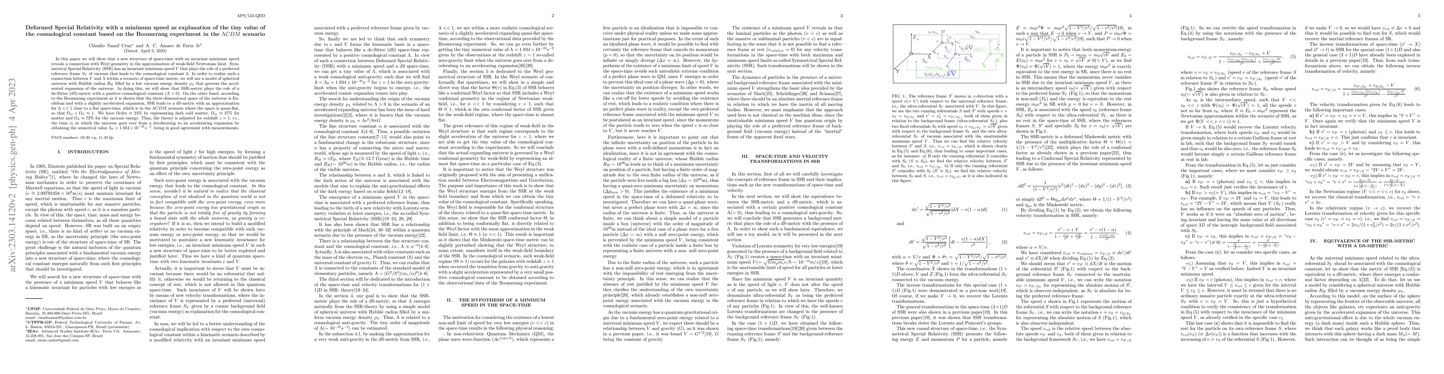 This paper proposes a deformed Special Relativity model with a minimum speed to explain the small cosmological constant, linking it to a preferred vacuum reference frame. It aligns this model with the $\Lambda CDM$ scenario, showing that it leads to a de-Sitter metric with a nearly flat space-time, consistent with the Boomerang experiment and the observed accelerated expansion of the universe.