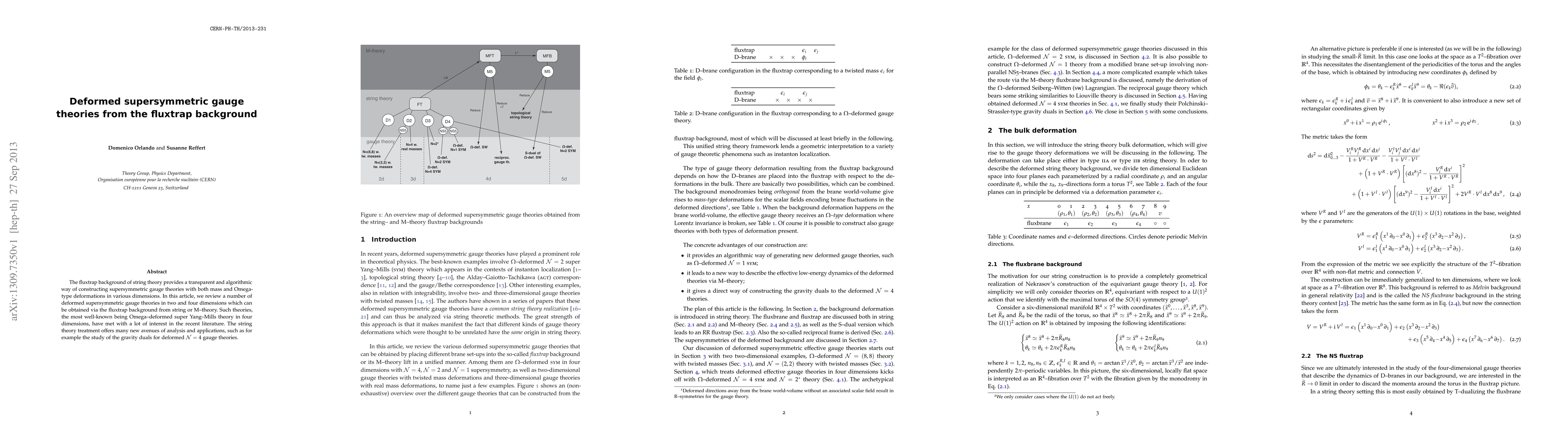 The fluxtrap background of string theory provides a transparent and algorithmic way of constructing supersymmetric gauge theories with both mass and Omega-type deformations in various dimensions. In this article, we review a number of deformed supersymmetric gauge theories in two and four dimensions which can be obtained via the fluxtrap background from string or M-theory. Such theories, the most well-known being Omega-deformed super Yang-Mills theory in four dimensions, have met with a lot of interest in the recent literature. The string theory treatment offers many new avenues of analysis and applications, such as for example the study of the gravity duals for deformed N=4 gauge theories.