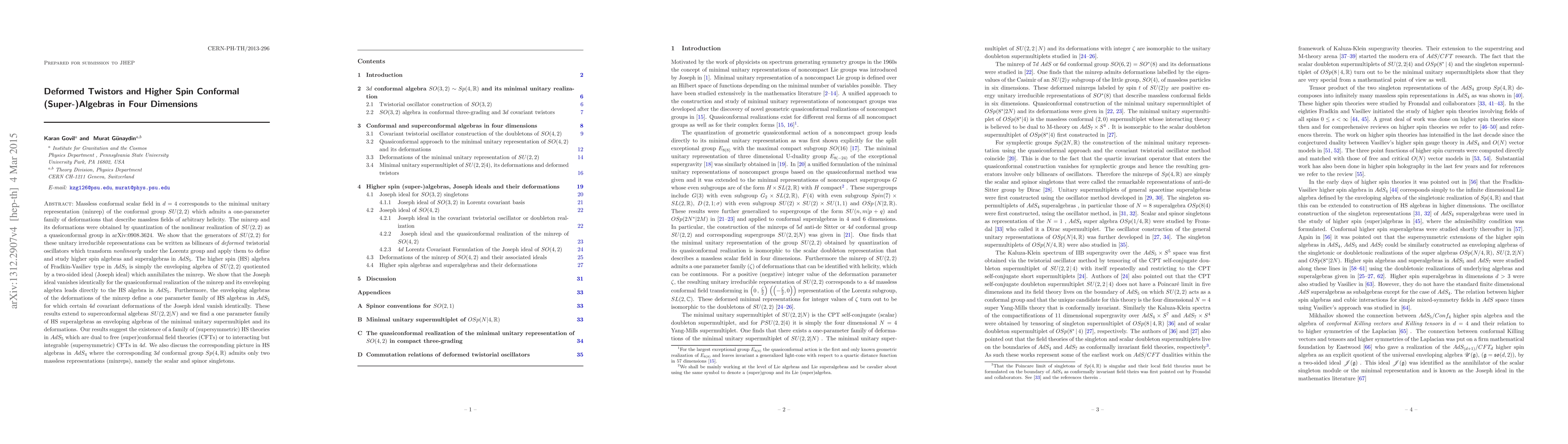 This research paper explores the connection between deformed twistors and higher spin conformal (super-)algebras in four dimensions. It reveals that the minimal unitary representation of SU(2,2) and its deformations can be expressed as bilinears of deformed twistorial oscillators, leading to the definition and study of higher spin algebras and superalgebras in AdS_5. The results suggest a family of (supersymmetric) higher spin theories in AdS_5 that are dual to free or integrable (super)conformal field theories in 4d.