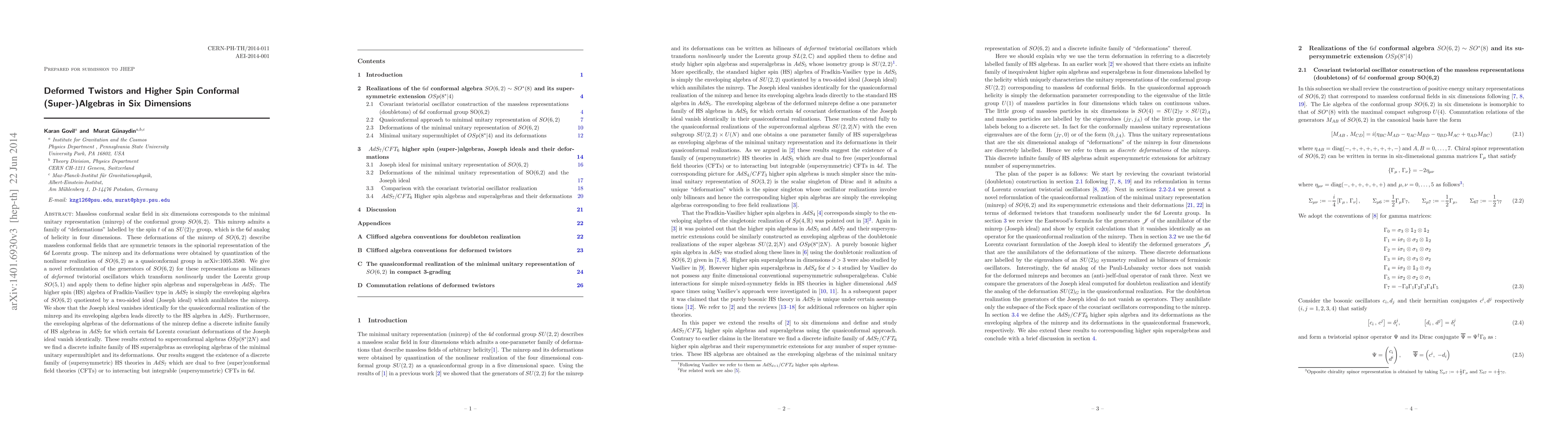 This paper explores the deformations of the minimal unitary representation of the conformal group SO(6,2) in six dimensions, revealing a family of massless conformal fields described by symmetric tensors. It reformulates the generators of SO(6,2) using bilinears of deformed twistors and applies these to define higher spin algebras and superalgebras in AdS_7, demonstrating the existence of a discrete infinite family of such algebras.