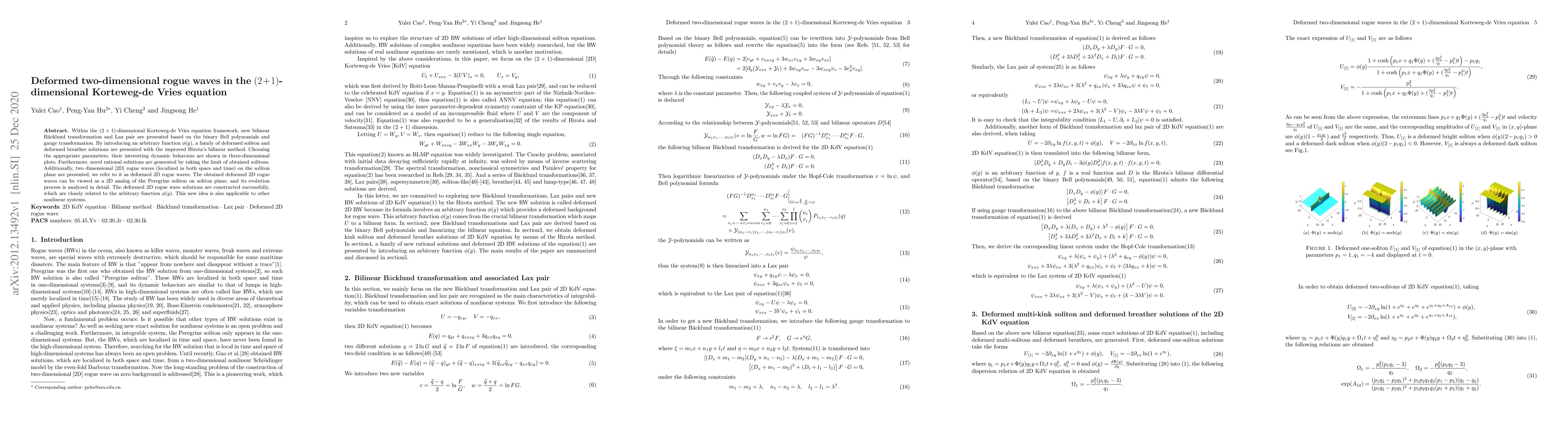 This paper introduces new solutions to the (2+1)-dimensional Korteweg-de Vries equation, including deformed solitons, breathers, and novel two-dimensional rogue waves, constructed using bilinear Backlund transformation and the Hirotas method. The study also analyzes the dynamic behaviors and evolution of these deformed 2D rogue waves, which are analogous to the Peregrine soliton.
