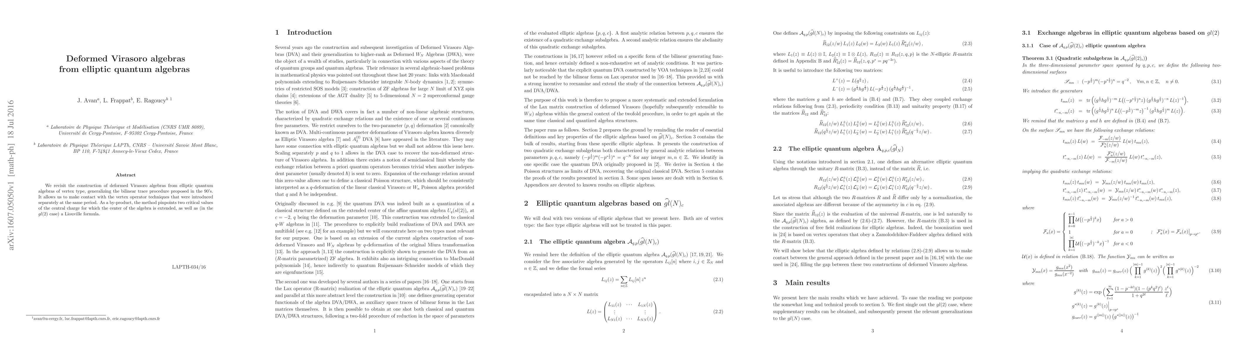 This paper extends a 90's method to construct deformed Virasoro algebras from elliptic quantum algebras, making contact with vertex operator techniques and pinning critical values of the central charge.