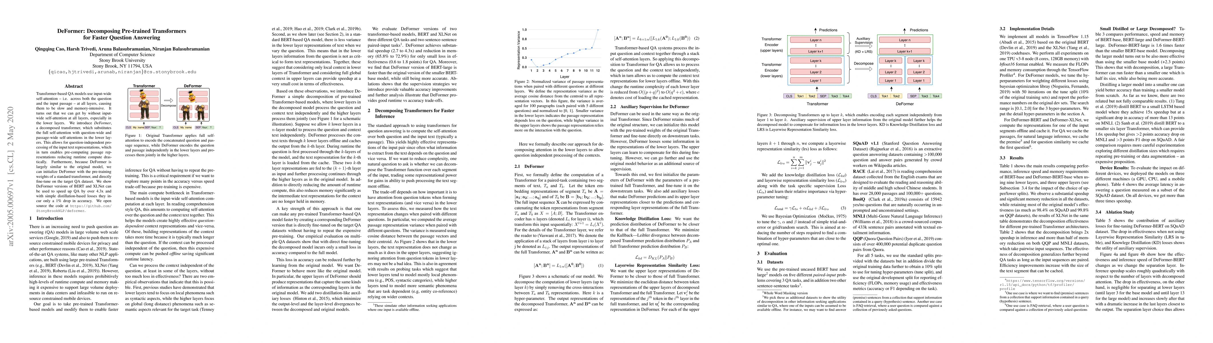 DeFormer is a decomposed transformer that speeds up question answering models by 4.3x, using pre-computed passage representations and fine-tuning existing transformer weights.