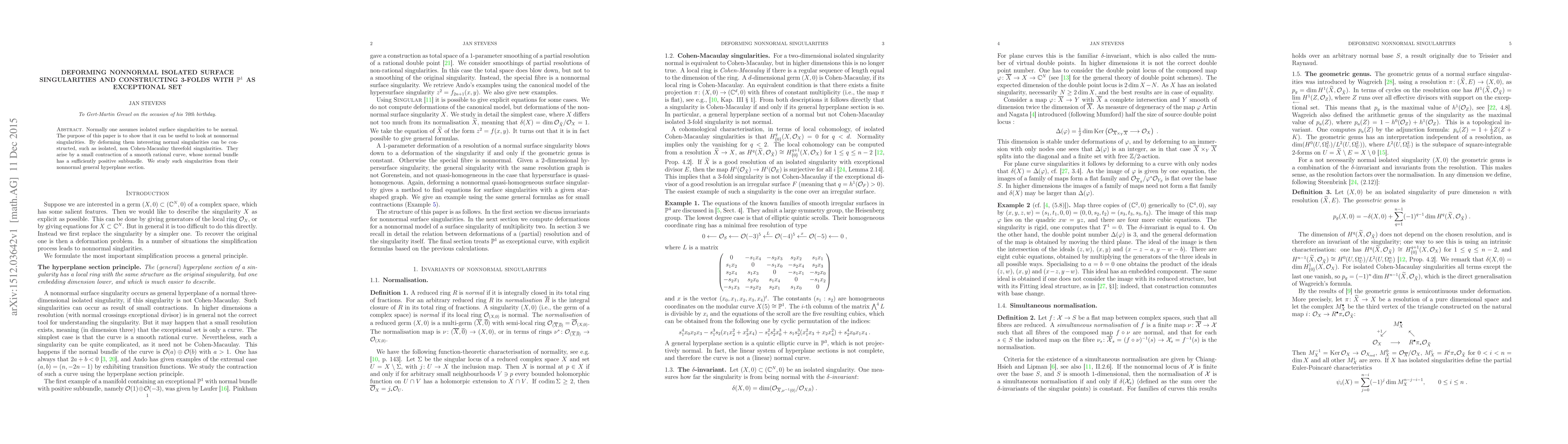 Normally one assumes isolated surface singularities to be normal. The purpose of this paper is to show that it can be useful to look at nonnormal singularities. By deforming them interesting normal singularities can be constructed, such as isolated, non Cohen-Macaulay threefold singularities. They arise by a small contraction of a smooth rational curve, whose normal bundle has a sufficiently positive subbundle. We study such singularities from their nonnormal general hyperplane section.