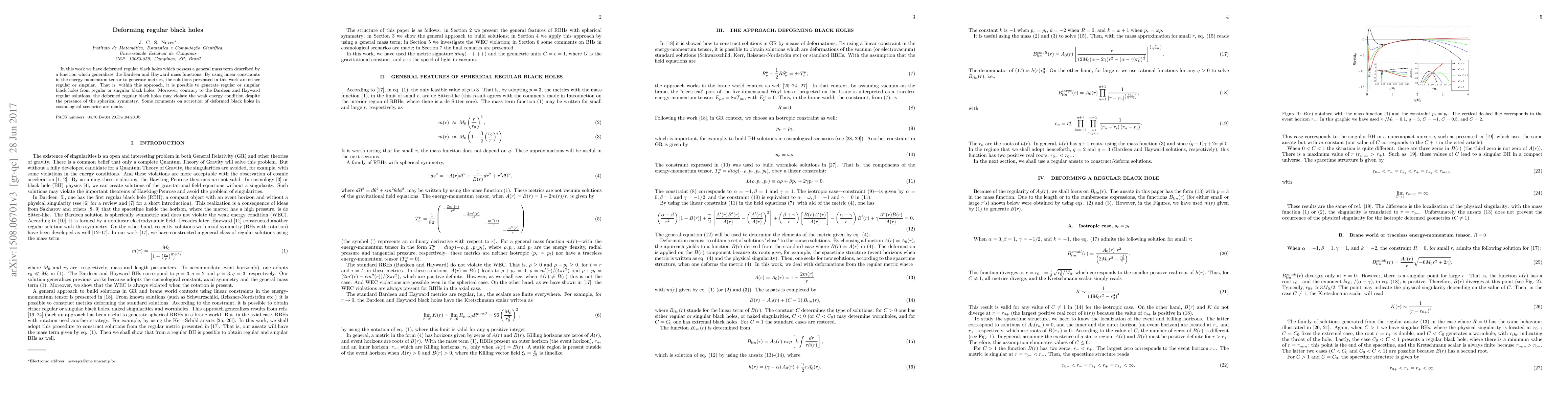 In this work we have deformed regular black holes which possess a general mass term described by a function which generalizes the Bardeen and Hayward mass functions. By using linear constraints in the energy-momentum tensor to generate metrics, the solutions presented in this work are either regular or singular. That is, within this approach, it is possible to generate regular or singular black holes from regular or singular black holes. Moreover, contrary to the Bardeen and Hayward regular solutions, the deformed regular black holes may violate the weak energy condition despite the presence of the spherical symmetry. Some comments on accretion of deformed black holes in cosmological scenarios are made.