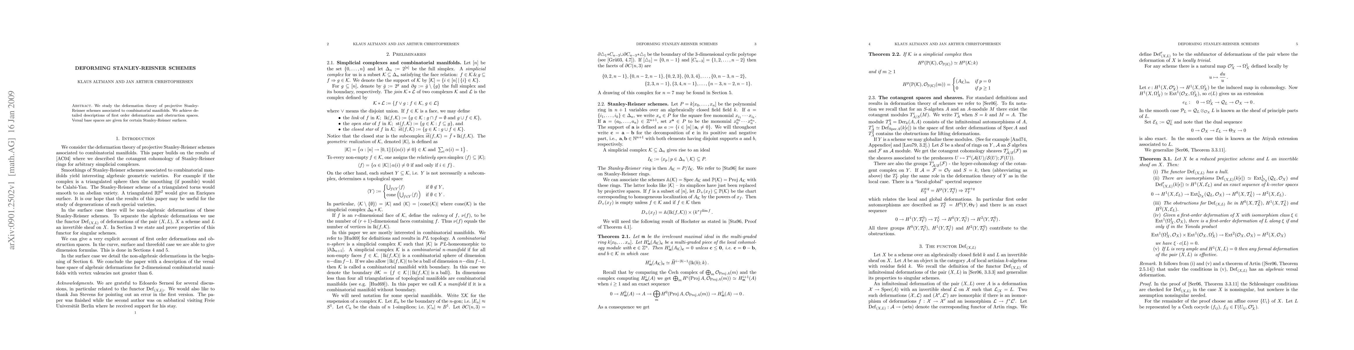 This paper investigates the deformation theory of projective Stanley-Reisner schemes tied to combinatorial manifolds, detailing first-order deformations and obstruction spaces, and providing versal base spaces for specific Stanley-Reisner surfaces.