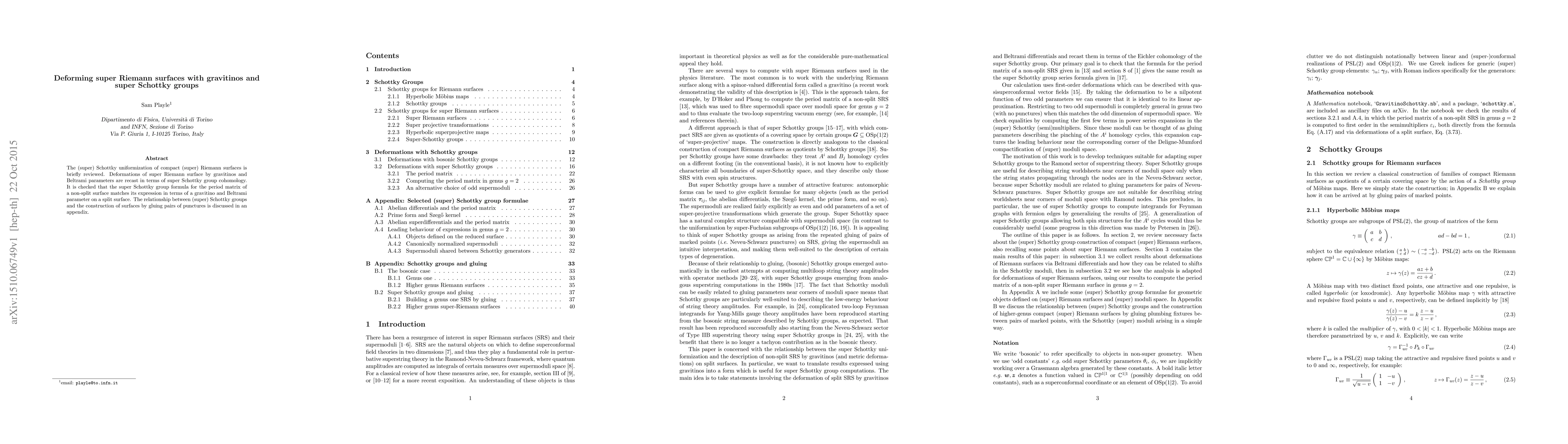 This paper reviews the (super) Schottky uniformization of compact (super) Riemann surfaces and recasts deformations using gravitinos and Beltrami parameters in terms of super Schottky group cohomology, verifying the equivalence between super Schottky group formulas and gravitino expressions. An appendix discusses the connection between (super) Schottky groups and the construction of surfaces via gluing punctures.