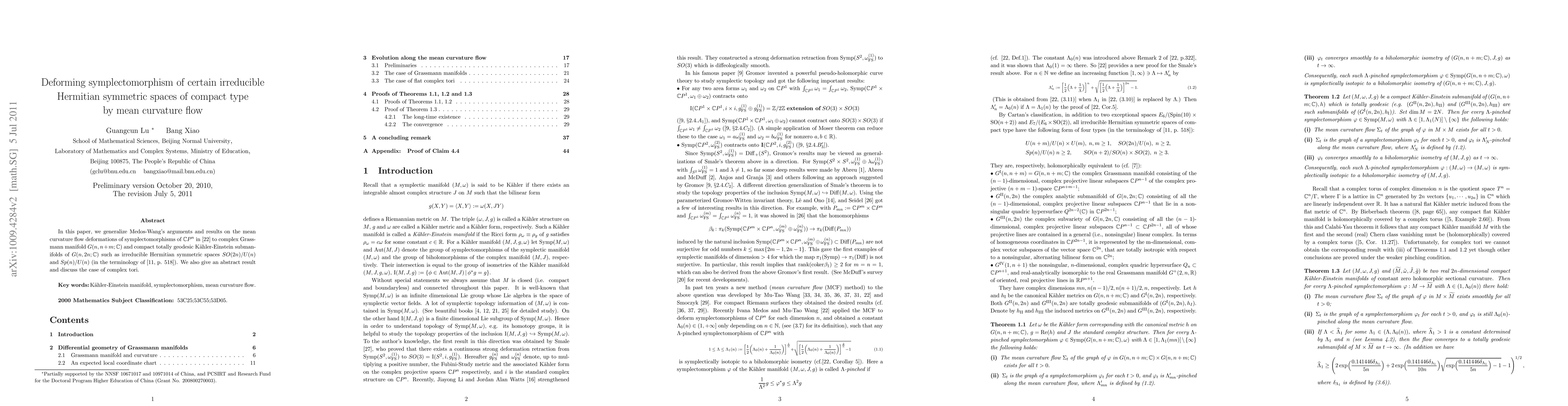 In this paper, we generalize Medos-Wang's arguments and results on the mean curvature flow deformations of symplectomorphisms of $\CP^n$ in \cite{MeWa} to complex Grassmann manifold $G(n, n+m;\C)$ and compact totally geodesic K\"ahler-Einstein submanifolds of $G(n, 2n;\C)$ such as irreducible Hermitian symmetric spaces $SO(2n)/U(n)$ and $Sp(n)/U(n)$ (in the terminology of \cite[p. 518]{He}). We also give an abstract result and discuss the case of complex tori.